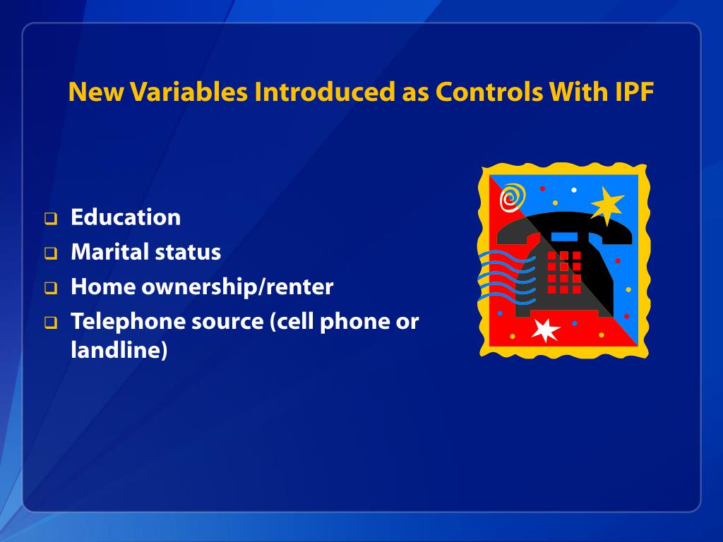 New Variables Introduced as Controls With IPF • Education • Marital status • Home ownership/renter • Telephone source (cell phone or landline)