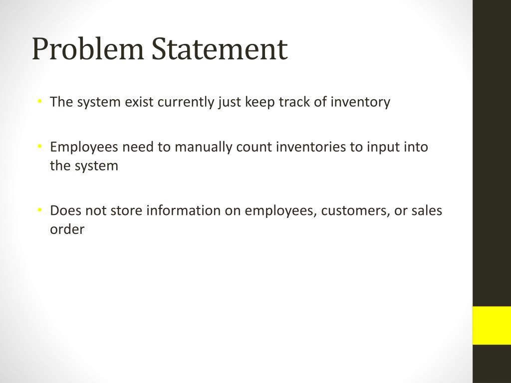 Problem Statement • The system exist currently just keep track of inventory • Employees need to manually count inventories to input into the system • Does not store information on employees, customers, or sales order