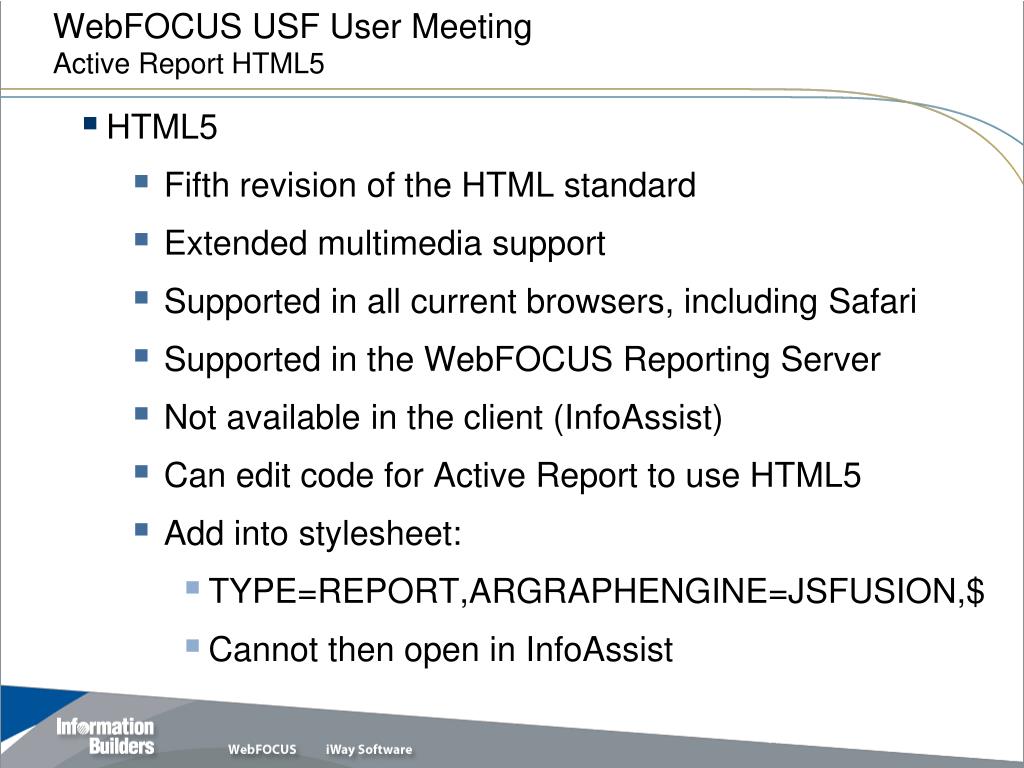 WebFOCUS USF User MeetingActive Report HTML5 • HTML5 • Fifth revision of the HTML standard • Extended multimedia support • Supported in all current browsers, including Safari • Supported in the WebFOCUS Reporting Server • Not available in the client (InfoAssist) • Can edit code for Active Report to use HTML5 • Add into stylesheet: • TYPE=REPORT,ARGRAPHENGINE=JSFUSION,$ • Cannot then open in InfoAssist