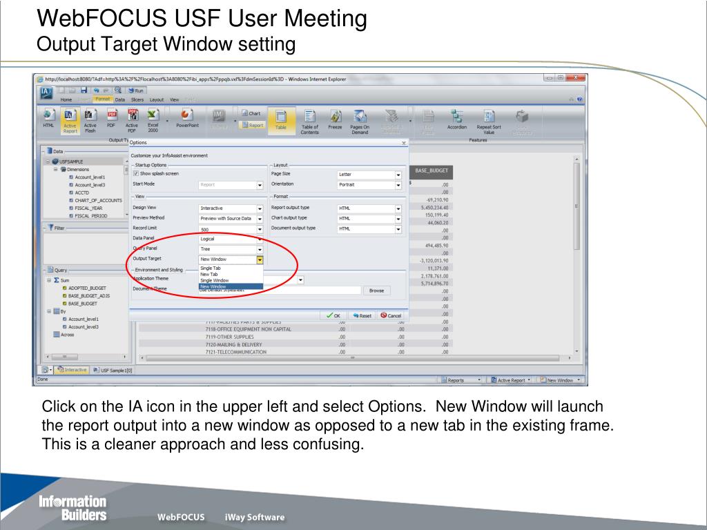 WebFOCUS USF User MeetingOutput Target Window setting Click on the IA icon in the upper left and select Options. New Window will launch the report output into a new window as opposed to a new tab in the existing frame. This is a cleaner approach and less confusing.