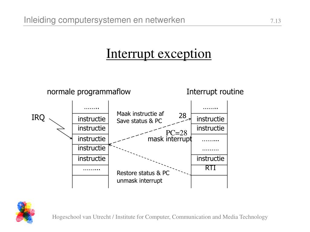 IRQ PC=28 mask interrupt Restore status & PC unmask interrupt Interrupt exception normale programmaflow Interrupt routine …….. instructie instructie instructie instructie instructie ……... …….. instructie instructie ……... ……… instructie RTI Maak instructie afSave status & PC 28 Hogeschool van Utrecht / Institute for Computer, Communication and Media Technology