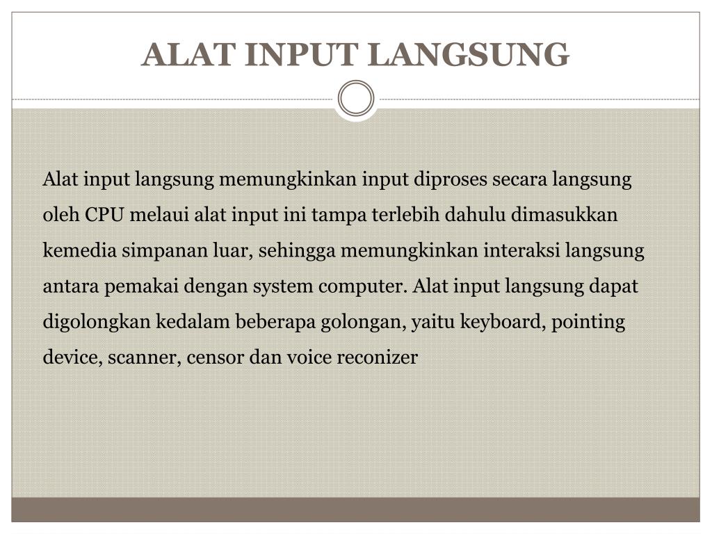 ALAT INPUT LANGSUNG Alat input langsungmemungkinkan input diprosessecaralangsungoleh CPU melauialat input initampaterlebihdahuludimasukkankemediasimpananluar, sehinggamemungkinkaninteraksilangsungantarapemakaidengan system computer. Alat input langsungdapatdigolongkankedalambeberapagolongan, yaitu keyboard, pointing device, scanner, censor dan voice reconizer