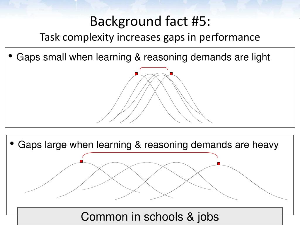 Background fact #5:Task complexity increases gaps in performance • Gaps small when learning & reasoning demands are light • Gaps large when learning & reasoning demands are heavy Common in schools & jobs 47
