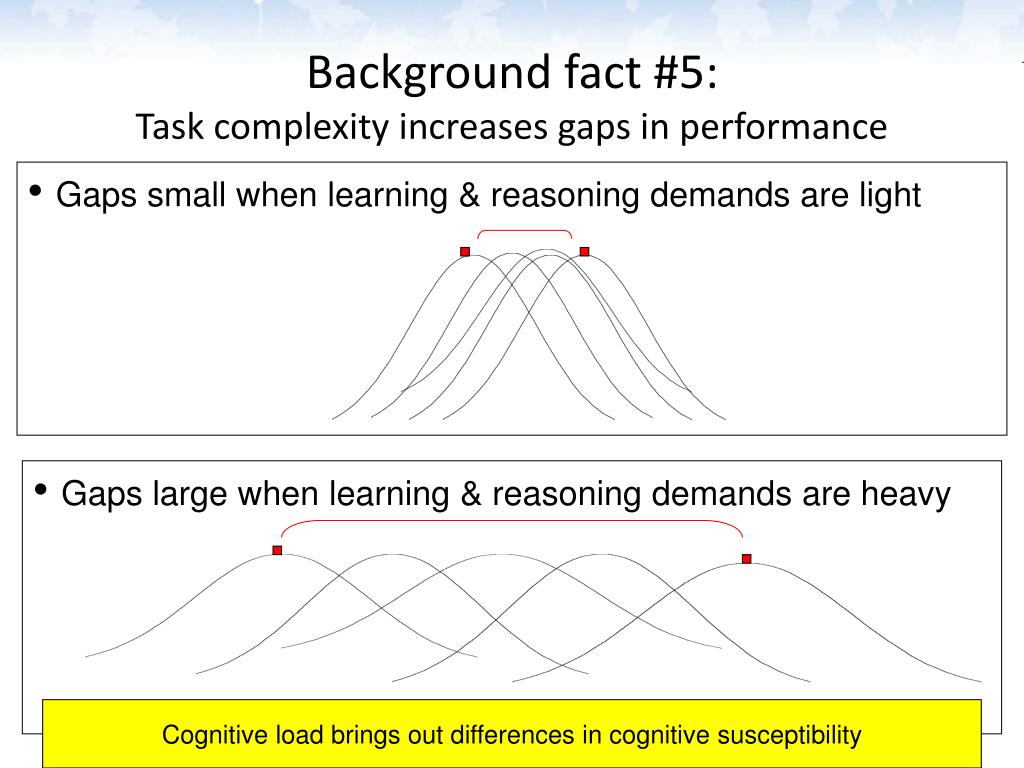 Background fact #5:Task complexity increases gaps in performance • Gaps small when learning & reasoning demands are light • Gaps large when learning & reasoning demands are heavy Cognitive load brings out differences in cognitive susceptibility Common in schools & jobs 48