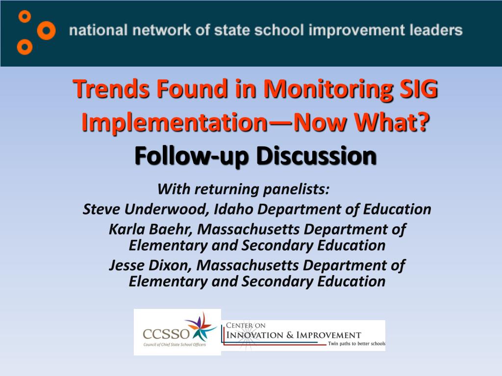 Trends Found in Monitoring SIG Implementation—Now What?Follow-up Discussion With returning panelists: Steve Underwood, Idaho Department of Education Karla Baehr, Massachusetts Department of Elementary and Secondary Education Jesse Dixon, Massachusetts Department of Elementary and Secondary Education
