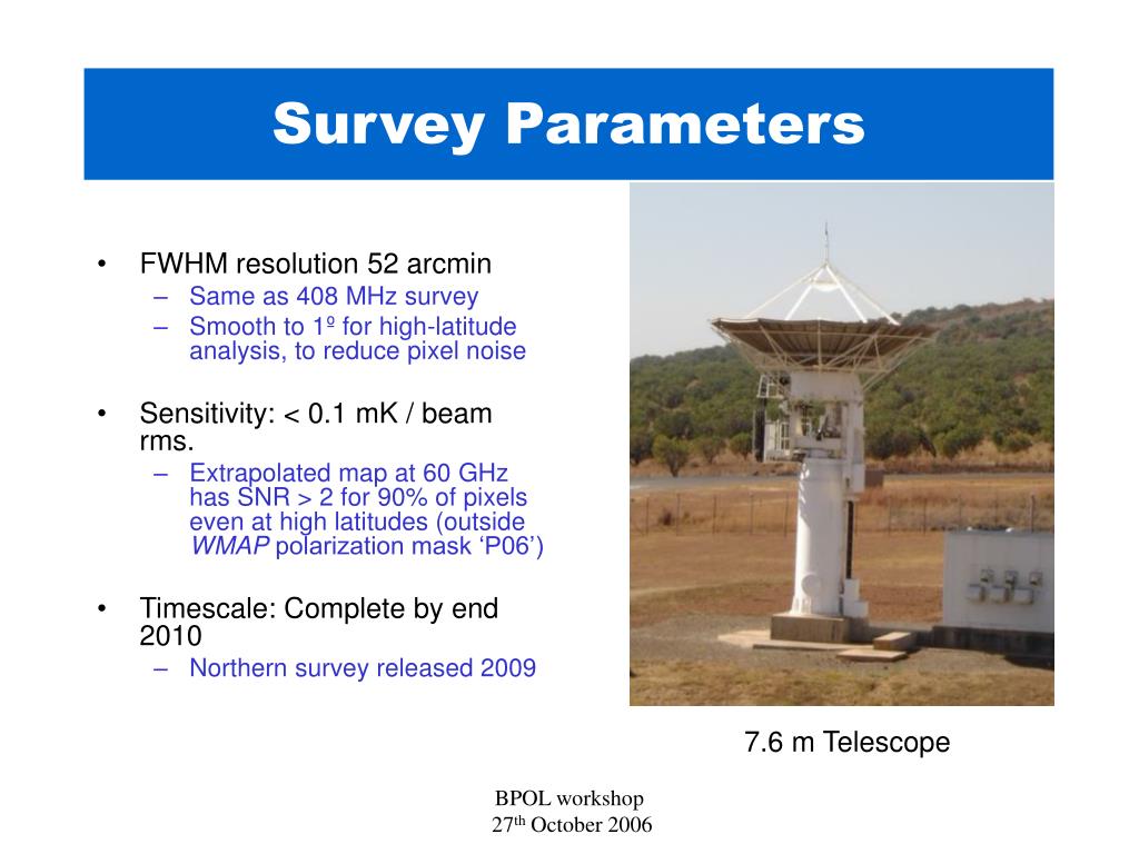 FWHM resolution 52 arcmin Same as 408MHz survey Smooth to 1º for high-latitude analysis, to reduce pixel noise Sensitivity: < 0.1 mK / beam rms. Extrapolated map at 60GHz has SNR > 2 for 90% of pixels even at high latitudes (outside WMAP polarization mask ‘P06’) Timescale: Complete by end 2010 Northern survey released 2009 Survey Parameters 7.6 m Telescope BPOL workshop 27th October 2006