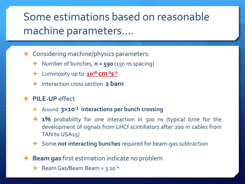 Some estimations based on reasonable machine parameters…. • Considering machine/physics parameters: • Number of bunches, n = 590 (150 ns spacing) • Luminosity up to 1028cm-2s-1 • Interaction cross section 2 barn • PILE-UP effect • Around 310-3interactions per bunch crossing • 1% probability for one interaction in 500 ns (typical time for the development of signals from LHCf scintillators after 200 m cables from TAN to USA15) • Some not interacting bunches required for beam-gas subtraction • Beam gas first estimation indicate no problem • Beam Gas/Beam Beam = 3.10-4