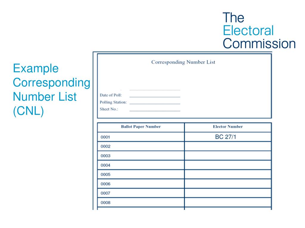 Issuing the ballot papers • Marking the register and the CNL • Ask the elector to confirm their name and address • Mark electors’ elector number in the register • Call out the name and elector number of the elector • Enter the elector number on the Corresponding Number List (CNL) • Do NOT write the elector number on the ballot paper!