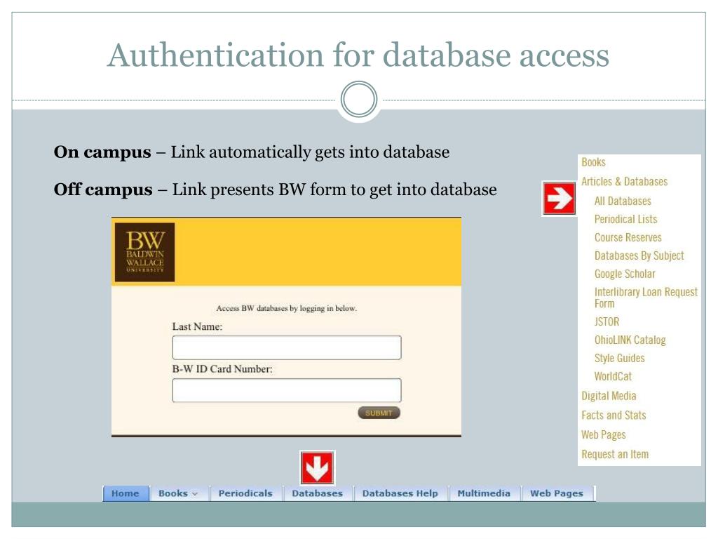 Authentication for database access On campus – Link automatically gets into database Off campus – Link presents BW form to get into database