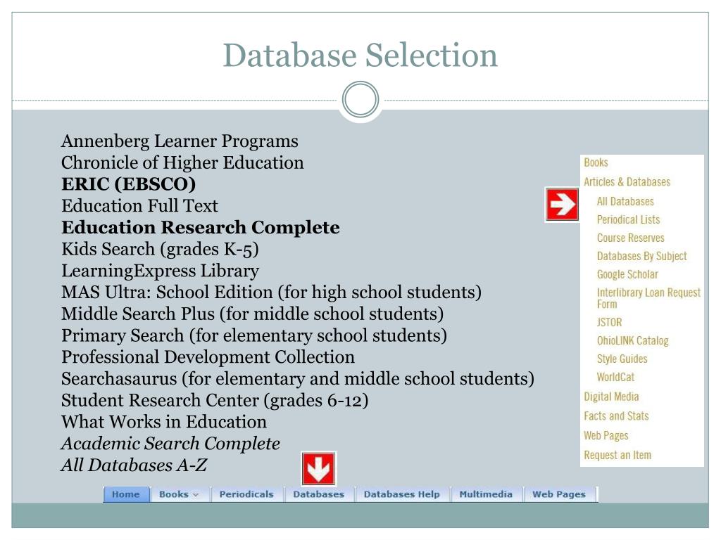 Database Selection Annenberg Learner Programs Chronicle of Higher Education ERIC (EBSCO) Education Full Text Education Research Complete Kids Search (grades K-5) LearningExpressLibrary MAS Ultra: School Edition (for high school students) Middle Search Plus (for middle school students) Primary Search (for elementary school students) Professional Development Collection Searchasaurus(for elementary and middle school students) Student Research Center (grades 6-12) What Works in Education Academic Search Complete All Databases A-Z