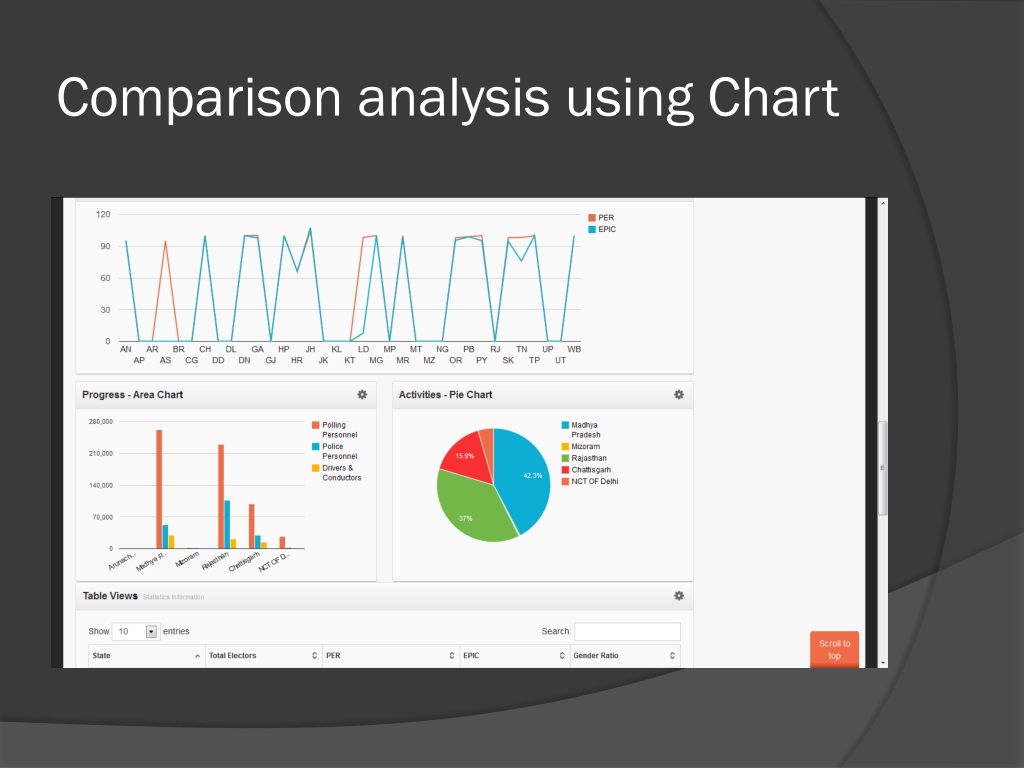 Process Designed to facilitate various election related reports in various formats. Application consists data entry module and display dashboard. Covers before poll, during poll and after poll activities. • Before Poll: • Officer Info, Polling Station Information, Polling Personnel, Law & Order, MCC, SVEEP, Complaint Information • During Poll: • Poll Event, Polling Incidence, District Turnout • After Poll: • AC Turnout, PS Turnout, Trends & Results