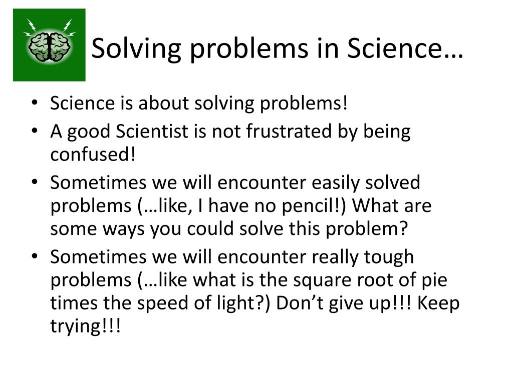 Solving problems in Science… • Science is about solving problems! • A good Scientist is not frustrated by being confused! • Sometimes we will encounter easily solved problems (…like, I have no pencil!) What are some ways you could solve this problem? • Sometimes we will encounter really tough problems (…like what is the square root of pie times the speed of light?) Don’t give up!!! Keep trying!!!