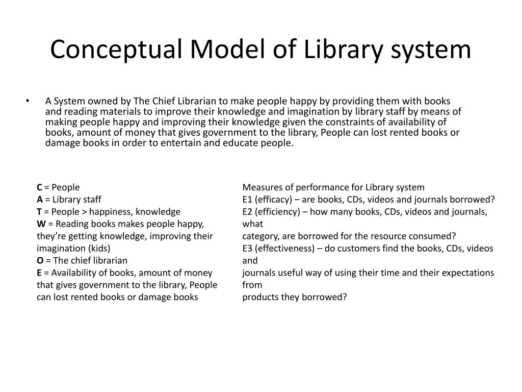 Conceptual Model of Library system • A System owned by The Chief Librarian to make people happy by providing them with books and reading materials to improve their knowledge and imagination by library staff by means of making people happy and improving their knowledge given the constraints of availability of books, amount of money that gives government to the library, People can lost rented books or damage books in order to entertain and educate people. C = People A = Library staff T = People > happiness, knowledge W = Reading books makes people happy, they’re getting knowledge, improving their imagination (kids) O = The chief librarian E = Availability of books, amount of money that gives government to the library, People can lost rented books or damage books Measures of performance for Library systemE1 (efficacy) – are books, CDs, videos and journals borrowed?E2 (efficiency) – how many books, CDs, videos and journals, whatcategory, are borrowed for the resource consumed?E3 (effectiveness) – do customers find the books, CDs, videos andjournals useful way of using their time and their expectations fromproducts they borrowed?