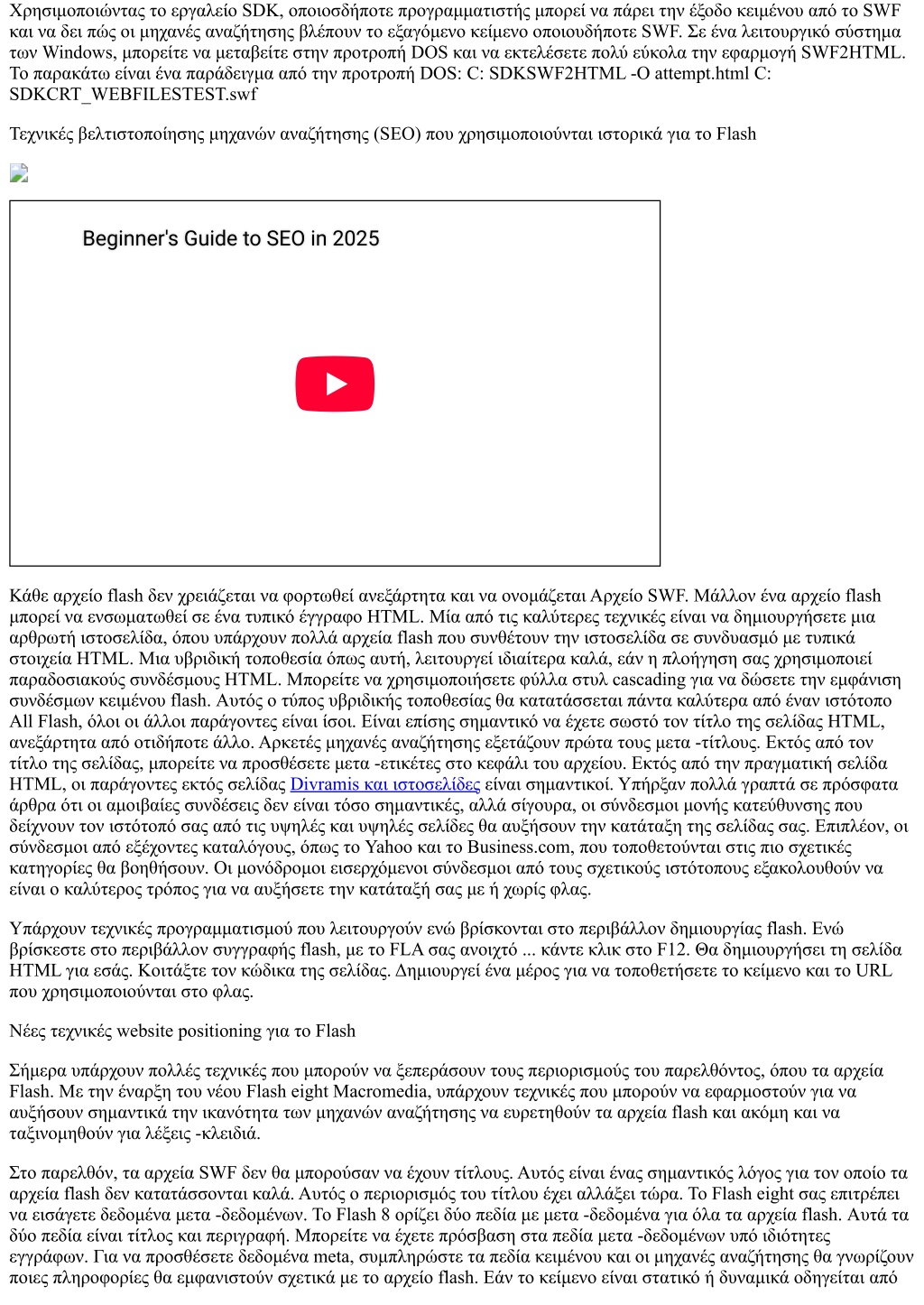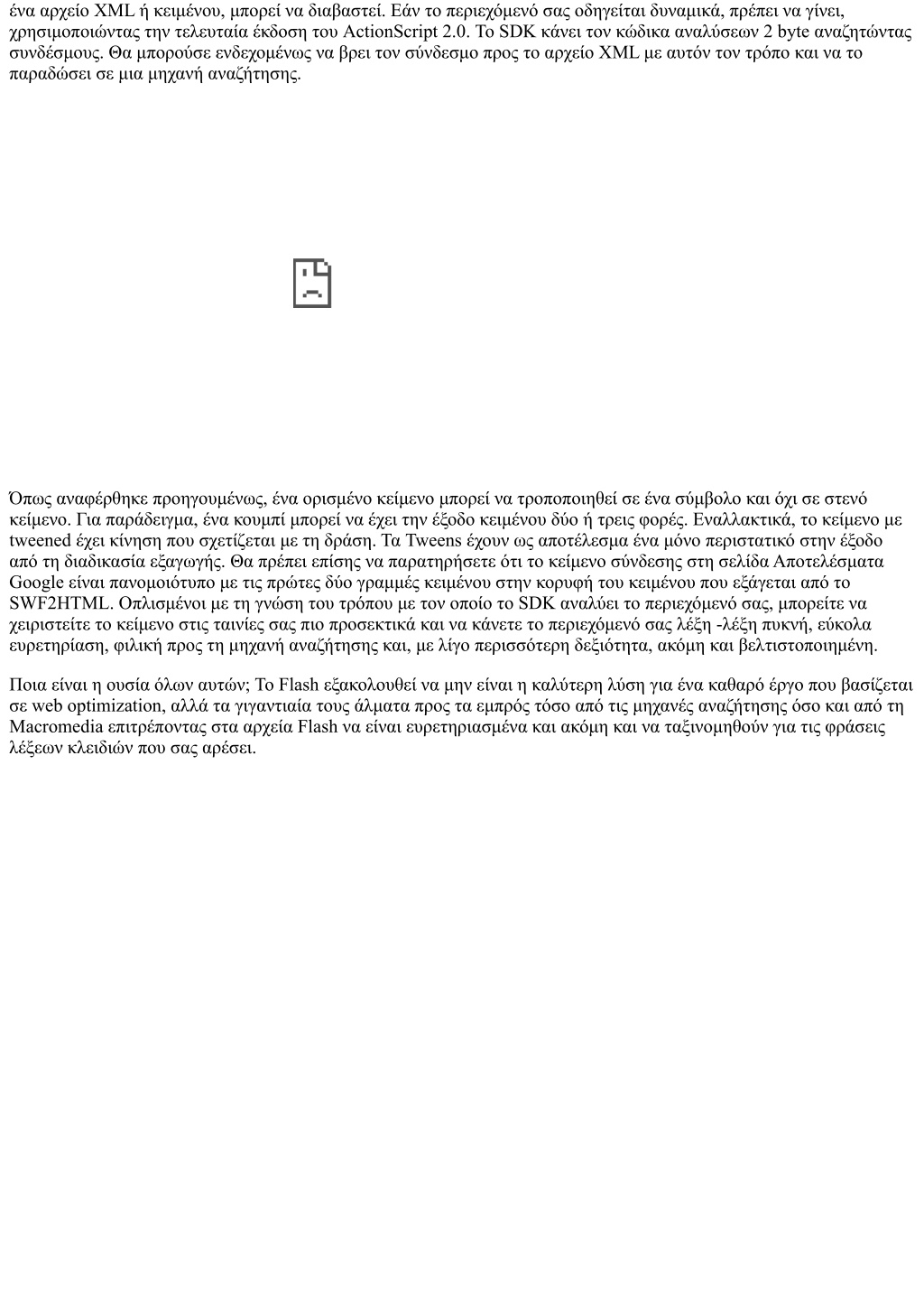 ένα αρχείο XML ή κειμένου, μπορεί να διαβαστεί. Εάν το περιεχόμενό σας οδηγείται δυναμικά, πρέπει να γίνει, χρησιμοποιώντας την τελευταία έκδοση του ActionScript 2.0. Το SDK κάνει τον κώδικα αναλύσεων 2 byte αναζητώντας συνδέσμους. Θα μπορούσε ενδεχομένως να βρει τον σύνδεσμο προς το αρχείο XML με αυτόν τον τρόπο και να το παραδώσει σε μια μηχανή αναζήτησης. Όπως αναφέρθηκε προηγουμένως, ένα ορισμένο κείμενο μπορεί να τροποποιηθεί σε ένα σύμβολο και όχι σε στενό κείμενο. Για παράδειγμα, ένα κουμπί μπορεί να έχει την έξοδο κειμένου δύο ή τρεις φορές. Εναλλακτικά, το κείμενο με tweened έχει κίνηση που σχετίζεται με τη δράση. Τα Tweens έχουν ως αποτέλεσμα ένα μόνο περιστατικό στην έξοδο από τη διαδικασία εξαγωγής. Θα πρέπει επίσης να παρατηρήσετε ότι το κείμενο σύνδεσης στη σελίδα Αποτελέσματα Google είναι πανομοιότυπο με τις πρώτες δύο γραμμές κειμένου στην κορυφή του κειμένου που εξάγεται από το SWF2HTML. Οπλισμένοι με τη γνώση του τρόπου με τον οποίο το SDK αναλύει το περιεχόμενό σας, μπορείτε να χειριστείτε το κείμενο στις ταινίες σας πιο προσεκτικά και να κάνετε το περιεχόμενό σας λέξη -λέξη πυκνή, εύκολα ευρετηρίαση, φιλική προς τη μηχανή αναζήτησης και, με λίγο περισσότερη δεξιότητα, ακόμη και βελτιστοποιημένη. Ποια είναι η ουσία όλων αυτών; Το Flash εξακολουθεί να μην είναι η καλύτερη λύση για ένα καθαρό έργο που βασίζεται σε web optimization, αλλά τα γιγαντιαία τους άλματα προς τα εμπρός τόσο από τις μηχανές αναζήτησης όσο και από τη Macromedia επιτρέποντας στα αρχεία Flash να είναι ευρετηριασμένα και ακόμη και να ταξινομηθούν για τις φράσεις λέξεων κλειδιών που σας αρέσει.