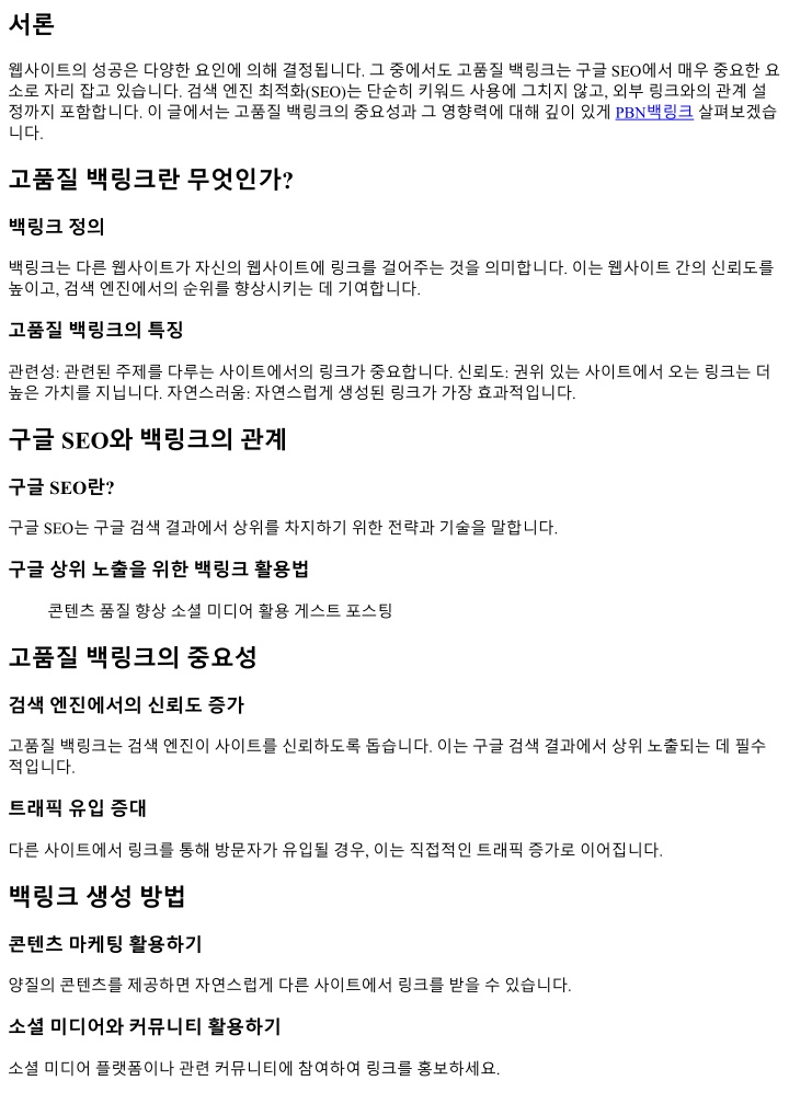 서론 웹사이트의성공은다양한요인에의해결정됩니다. 그중에서도고품질백링크는구글 SEO에서매우중요한요 소로자리잡고있습니다. 검색엔진최적화(SEO)는단순히키워드사용에그치지않고, 외부링크와의관계설 정까지포함합니다. 이글에서는고품질백링크의중요성과그영향력에대해깊이있게PBN백링크살펴보겠습 니다. 고품질백링크란무엇인가? 백링크정의 백링크는다른웹사이트가자신의웹사이트에링크를걸어주는것을의미합니다. 이는웹사이트간의신뢰도를 높이고, 검색엔진에서의순위를향상시키는데기여합니다. 고품질백링크의특징 관련성: 관련된주제를다루는사이트에서의링크가중요합니다. 신뢰도: 권위있는사이트에서오는링크는더 높은가치를지닙니다. 자연스러움: 자연스럽게생성된링크가가장효과적입니다. 구글 SEO와백링크의관계 구글 SEO란? 구글 SEO는구글검색결과에서상위를차지하기위한전략과기술을말합니다. 구글상위노출을위한백링크활용법 콘텐츠품질향상소셜미디어활용게스트포스팅 고품질백링크의중요성 검색엔진에서의신뢰도증가 고품질백링크는검색엔진이사이트를신뢰하도록돕습니다. 이는구글검색결과에서상위노출되는데필수 적입니다. 트래픽유입증대 다른사이트에서링크를통해방문자가유입될경우, 이는직접적인트래픽증가로이어집니다. 백링크생성방법 콘텐츠마케팅활용하기 양질의콘텐츠를제공하면자연스럽게다른사이트에서링크를받을수있습니다. 소셜미디어와커뮤니티활용하기 소셜미디어플랫폼이나관련커뮤니티에참여하여링크를홍보하세요.