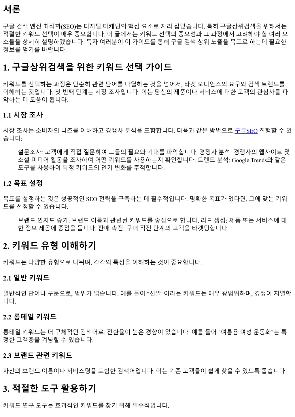 서론 구글검색엔진최적화(SEO)는디지털마케팅의핵심요소로자리잡았습니다. 특히구글상위검색을위해서는 적절한키워드선택이매우중요합니다. 이글에서는키워드선택의중요성과그과정에서고려해야할여러요 소들을상세히설명하겠습니다. 독자여러분이이가이드를통해구글검색상위노출을목표로하는데필요한 정보를얻기를바랍니다. 1. 구글상위검색을위한키워드선택가이드 키워드를선택하는과정은단순히관련단어를나열하는것을넘어서, 타겟오디언스의요구와검색트렌드를 이해하는것입니다. 첫번째단계는시장조사입니다. 이는당신의제품이나서비스에대한고객의관심사를파 악하는데도움이됩니다. 1.1 시장조사 시장조사는소비자의니즈를이해하고경쟁사분석을포함합니다. 다음과같은방법으로구글SEO진행할수있 습니다: 설문조사: 고객에게직접질문하여그들의필요와기대를파악합니다. 경쟁사분석: 경쟁사의웹사이트및 소셜미디어활동을조사하여어떤키워드를사용하는지확인합니다. 트렌드분석: Google Trends와같은 도구를사용하여특정키워드의인기변화를추적합니다. 1.2 목표설정 목표를설정하는것은성공적인 SEO 전략을구축하는데필수적입니다. 명확한목표가있다면, 그에맞는키워 드를선정할수있습니다. 브랜드인지도증가: 브랜드이름과관련된키워드를중심으로합니다. 리드생성: 제품또는서비스에대 한정보제공에중점을둡니다. 판매촉진: 구매직전단계의고객을타겟팅합니다. 2. 키워드유형이해하기 키워드는다양한유형으로나뉘며, 각각의특성을이해하는것이중요합니다. 2.1 일반키워드 일반적인단어나구문으로, 범위가넓습니다. 예를들어 "신발"이라는키워드는매우광범위하며, 경쟁이치열합 니다. 2.2 롱테일키워드 롱테일키워드는더구체적인검색어로, 전환율이높은경향이있습니다. 예를들어 "여름용여성운동화"는특 정한고객층을겨냥할수있습니다. 2.3 브랜드관련키워드 자신의브랜드이름이나서비스명을포함한검색어입니다. 이는기존고객들이쉽게찾을수있도록돕습니다. 3. 적절한도구활용하기 키워드연구도구는효과적인키워드를찾기위해필수적입니다.
