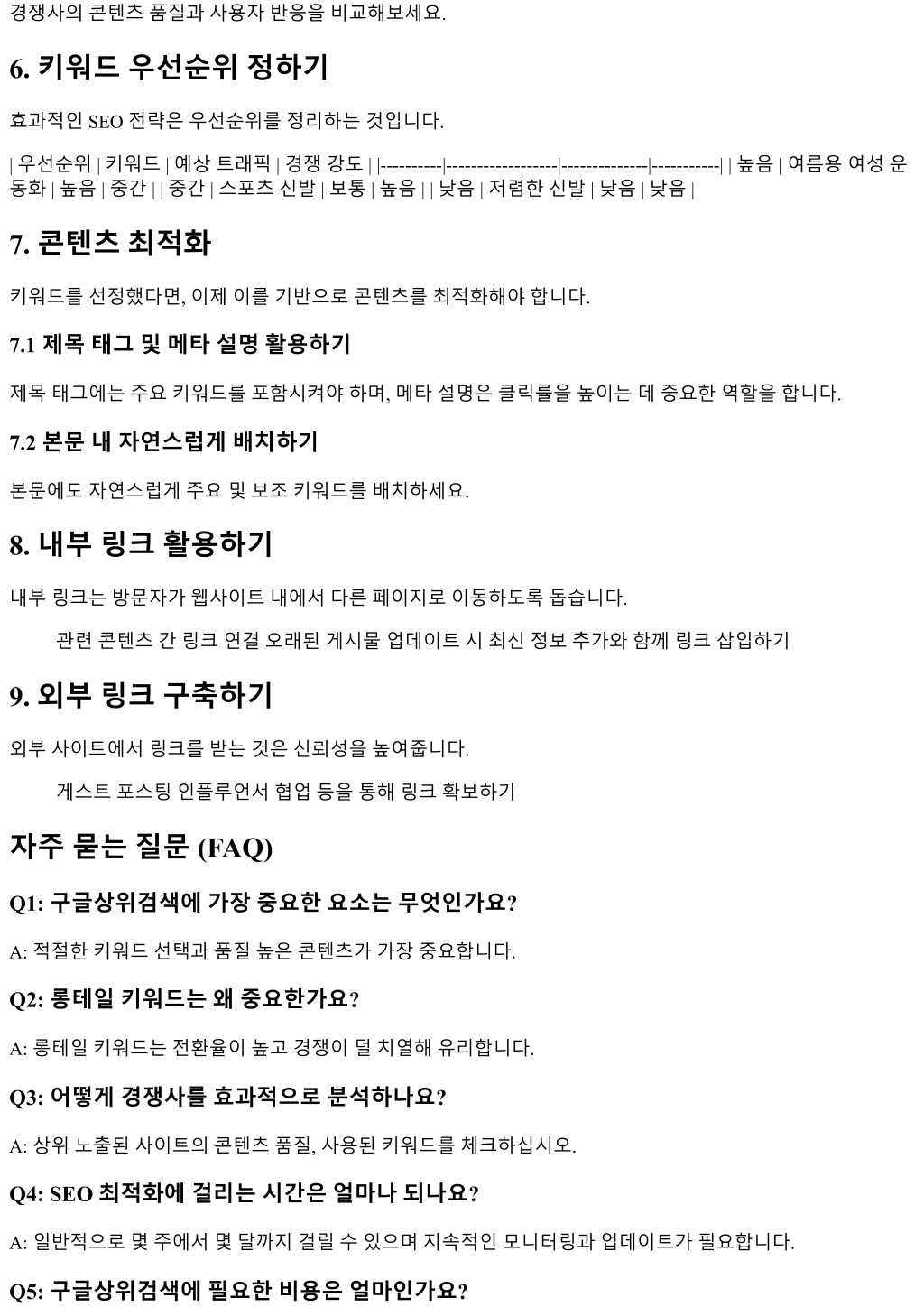 경쟁사의콘텐츠품질과사용자반응을비교해보세요.경쟁사의콘텐츠품질과사용자반응을비교해보세요. 6. 키워드우선순위정하기 효과적인 SEO 전략은우선순위를정리하는것입니다. | 우선순위 | 키워드 | 예상트래픽 | 경쟁강도 | |----------|------------------|--------------|-----------| | 높음 | 여름용여성운 동화 | 높음 | 중간 | | 중간 | 스포츠신발 | 보통 | 높음 | | 낮음 | 저렴한신발 | 낮음 | 낮음 | 7. 콘텐츠최적화 키워드를선정했다면, 이제이를기반으로콘텐츠를최적화해야합니다. 7.1 제목태그및메타설명활용하기 제목태그에는주요키워드를포함시켜야하며, 메타설명은클릭률을높이는데중요한역할을합니다. 7.2 본문내자연스럽게배치하기 본문에도자연스럽게주요및보조키워드를배치하세요. 8. 내부링크활용하기 내부링크는방문자가웹사이트내에서다른페이지로이동하도록돕습니다. 관련콘텐츠간링크연결오래된게시물업데이트시최신정보추가와함께링크삽입하기 9. 외부링크구축하기 외부사이트에서링크를받는것은신뢰성을높여줍니다. 게스트포스팅인플루언서협업등을통해링크확보하기 자주묻는질문 (FAQ) Q1: 구글상위검색에가장중요한요소는무엇인가요? A: 적절한키워드선택과품질높은콘텐츠가가장중요합니다. Q2: 롱테일키워드는왜중요한가요? A: 롱테일키워드는전환율이높고경쟁이덜치열해유리합니다. Q3: 어떻게경쟁사를효과적으로분석하나요? A: 상위노출된사이트의콘텐츠품질, 사용된키워드를체크하십시오. Q4: SEO 최적화에걸리는시간은얼마나되나요? A: 일반적으로몇주에서몇달까지걸릴수있으며지속적인모니터링과업데이트가필요합니다. Q5: 구글상위검색에필요한비용은얼마인가요?