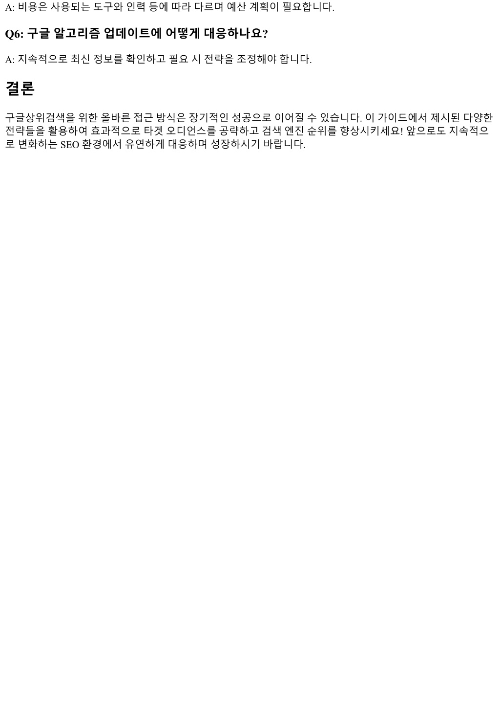 A: 비용은사용되는도구와인력등에따라다르며예산계획이필요합니다. Q6: 구글알고리즘업데이트에어떻게대응하나요? A: 지속적으로최신정보를확인하고필요시전략을조정해야합니다. 결론 구글상위검색을위한올바른접근방식은장기적인성공으로이어질수있습니다. 이가이드에서제시된다양한 전략들을활용하여효과적으로타겟오디언스를공략하고검색엔진순위를향상시키세요! 앞으로도지속적으 로변화하는 SEO 환경에서유연하게대응하며성장하시기바랍니다.
