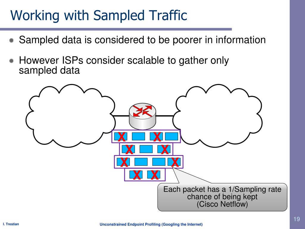 Working with Sampled Traffic Sampled data is considered to be poorer in information However ISPs consider scalable to gather only sampled data X X X X X X X X Each packet has a 1/Sampling rate chance of being kept (Cisco Netflow)