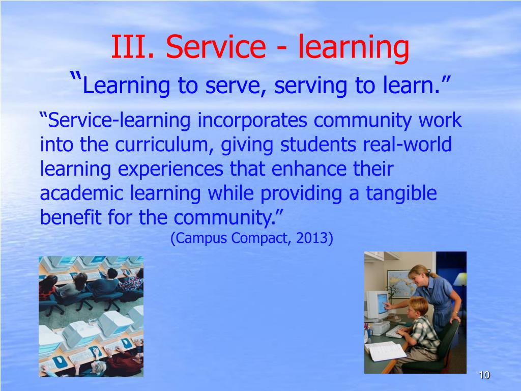 III. Service - learning“Learning to serve, serving to learn.” “Service-learning incorporates community work into the curriculum, giving students real-world learning experiences that enhance their academic learning while providing a tangible benefit for the community.” (Campus Compact, 2013)