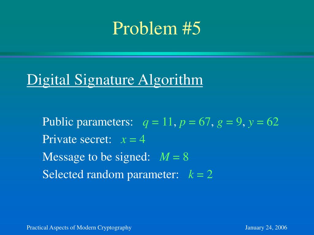 Problem #5 Digital Signature Algorithm Public parameters: q = 11, p = 67, g = 9, y = 62 Private secret: x = 4 Message to be signed: M = 8 Selected random parameter: k = 2 Practical Aspects of Modern Cryptography