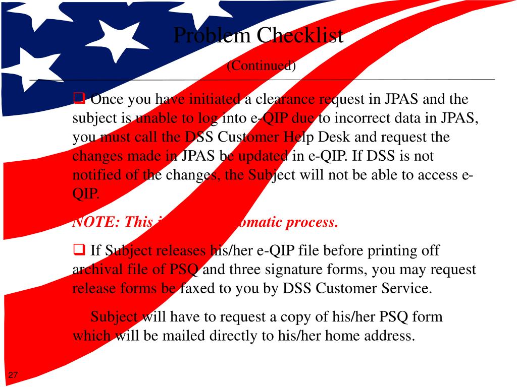 Problem Checklist(Continued) • Once you have initiated a clearance request in JPAS and the subject is unable to log into e-QIP due to incorrect data in JPAS, you must call the DSS Customer Help Desk and request the changes made in JPAS be updated in e-QIP. If DSS is not notified of the changes, the Subject will not be able to access e-QIP. NOTE: This is not an automatic process. • If Subject releases his/her e-QIP file before printing off archival file of PSQ and three signature forms, you may request release forms be faxed to you by DSS Customer Service. • Subject will have to request a copy of his/her PSQ form which will be mailed directly to his/her home address.