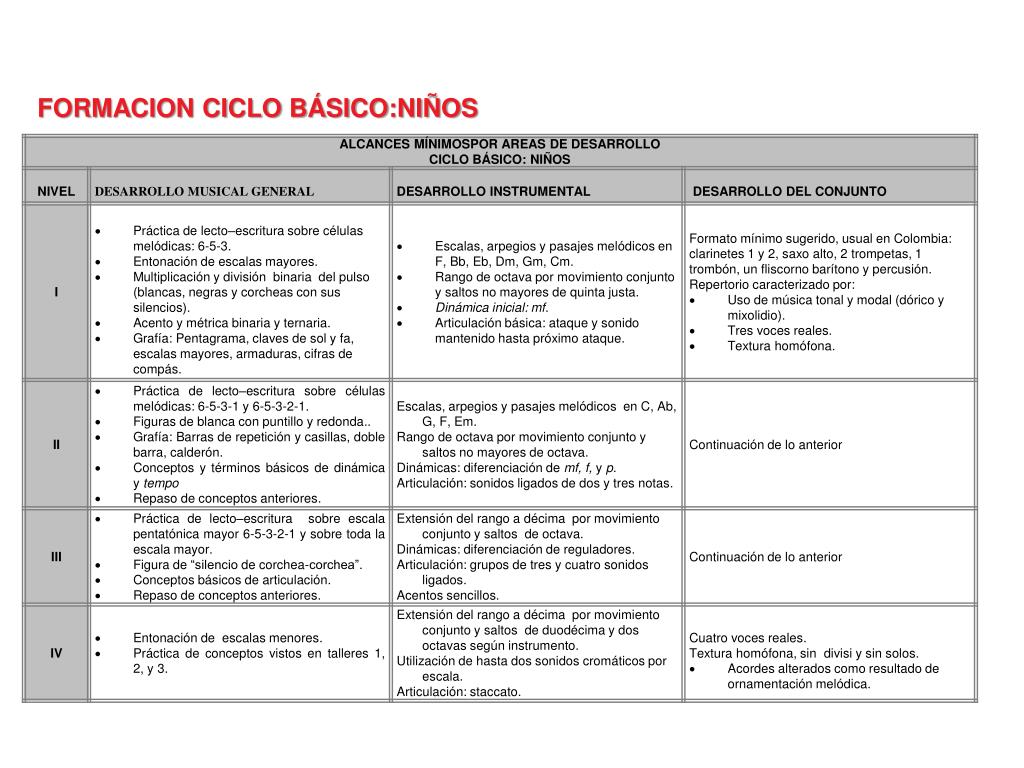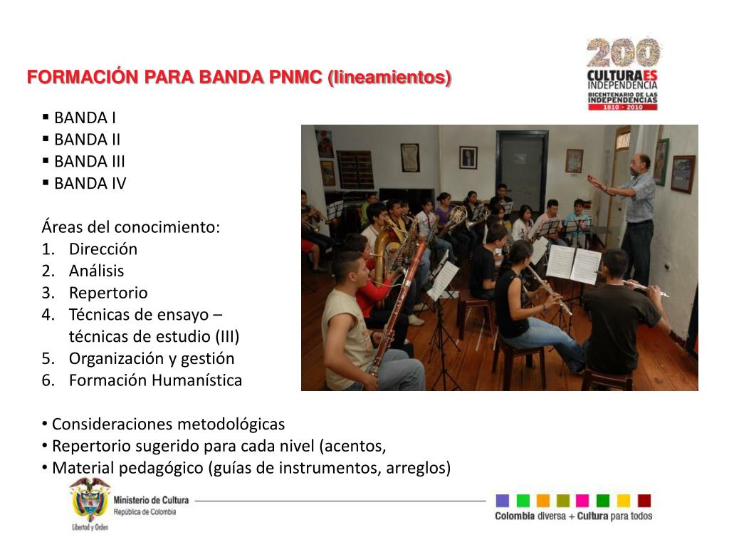 FORMACIÓN PARA BANDA PNMC (lineamientos) • BANDA I • BANDA II • BANDA III • BANDA IV • Áreas del conocimiento: • Dirección • Análisis • Repertorio • Técnicas de ensayo – técnicas de estudio (III) • Organización y gestión • Formación Humanística • Consideraciones metodológicas • Repertorio sugerido para cada nivel (acentos, • Material pedagógico (guías de instrumentos, arreglos)