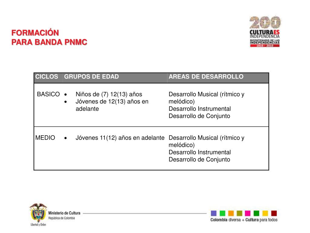 FORMACION PNMC BANDAS 2003 – 2006 (CICLO BÁSICO) • PARÁMETROS DE FORMACIÓN para la educación no formal en torno a las prácticas colectivas. (LINEAMIENTOS) • FORMACIÓN DE FORMADORES • 2007 – 2010 (CICLO MEDIO) • FORMACIÓN DE FORMADORES (Seminarios, profesionalización) • ESTRUCTURACIÓN DE LINEAMIENTOS • CUALIFICACIÓN TÉCNICA DE INSTRUMENTISTAS: Seminarios para jóvenes instrumentistas • DIVERSIFICACIÓN DE LINEAS FORMATIVAS