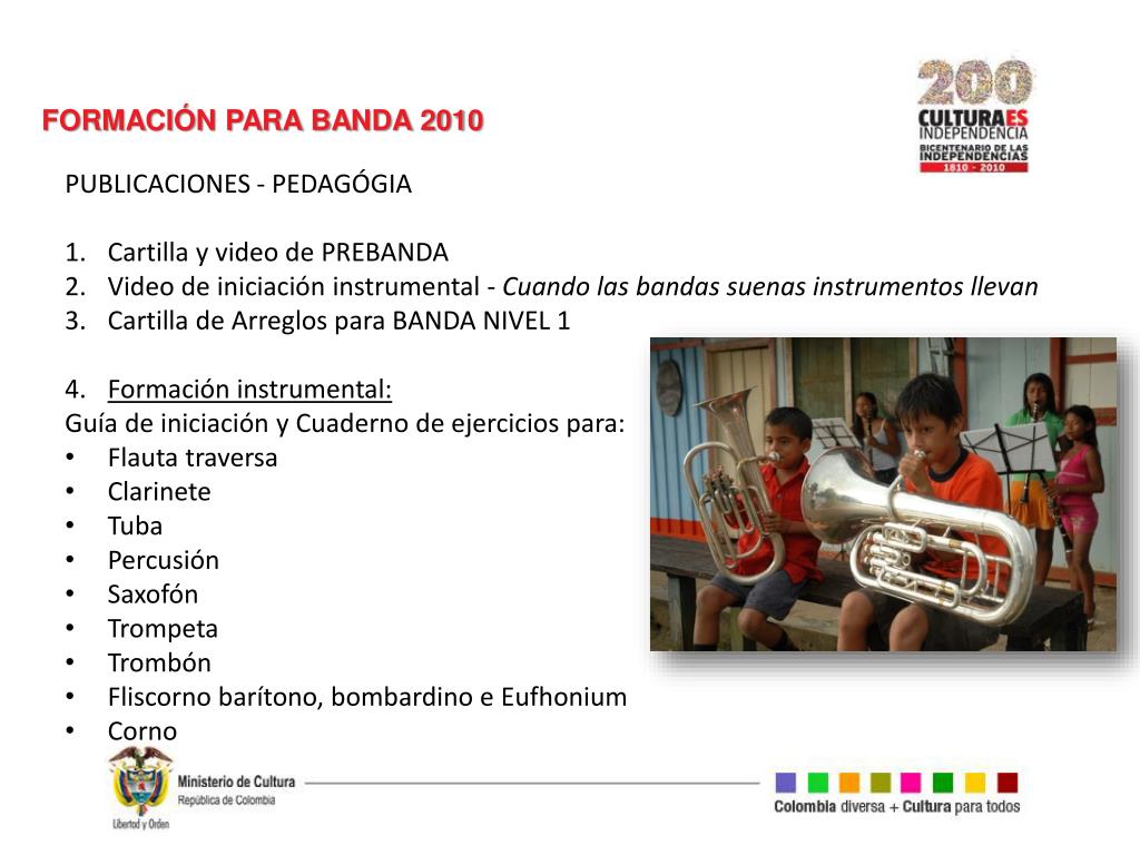 FORMACIÓN PARA BANDA 2010 • PUBLICACIONES - PEDAGÓGIA • Cartilla y video de PREBANDA • Video de iniciación instrumental - Cuando las bandas suenas instrumentos llevan • Cartilla de Arreglos para BANDA NIVEL 1 • Formación instrumental: • Guía de iniciación y Cuaderno de ejercicios para: • Flauta traversa • Clarinete • Tuba • Percusión • Saxofón • Trompeta • Trombón • Fliscorno barítono, bombardino e Eufhonium • Corno