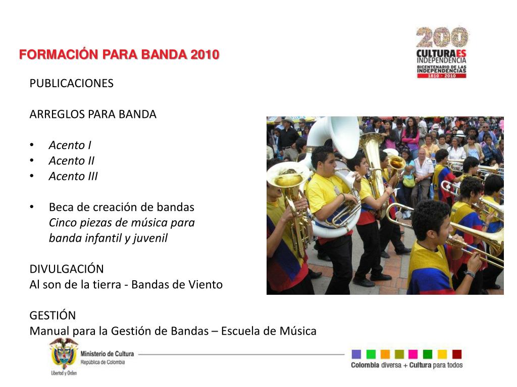 FORMACIÓN PARA BANDA 2010 • PUBLICACIONES • ARREGLOS PARA BANDA • Acento I • Acento II • Acento III • Beca de creación de bandas • Cinco piezas de música para • banda infantil y juvenil • DIVULGACIÓN • Al son de la tierra - Bandas de Viento • GESTIÓN • Manual para la Gestión de Bandas – Escuela de Música