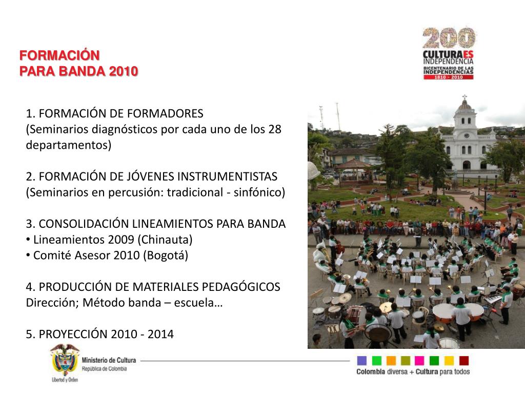 FORMACIÓN PARA BANDA 2010 • 1. FORMACIÓN DE FORMADORES • (Seminarios diagnósticos por cada uno de los 28 • departamentos) • 2. FORMACIÓN DE JÓVENES INSTRUMENTISTAS • (Seminarios en percusión: tradicional - sinfónico) • 3. CONSOLIDACIÓN LINEAMIENTOS PARA BANDA • Lineamientos 2009 (Chinauta) • Comité Asesor 2010 (Bogotá) • 4. PRODUCCIÓN DE MATERIALES PEDAGÓGICOS • Dirección; Método banda – escuela… • 5. PROYECCIÓN 2010 - 2014