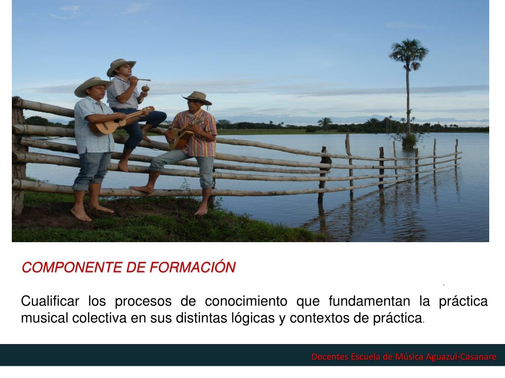 PLAN NACIONAL DE MÚSICA PARA LA CONVIVENCIA Formación en prácticas colectivas. COMPONENTE DE FORMACIÓN Cualificar los procesos de conocimiento que fundamentan la práctica musical colectiva en sus distintas lógicas y contextos de práctica . . Docentes Escuela de Música Aguazul-Casanare.
