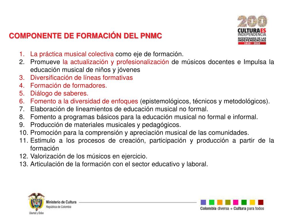 COMPONENTE DE FORMACIÓN DEL PNMC La práctica musical colectiva como eje de formación. Promueve la actualización y profesionalización de músicos docentes e Impulsa la educación musical de niños y jóvenes Diversificación de líneas formativas Formación de formadores. Diálogo de saberes. Fomento a la diversidad de enfoques(epistemológicos, técnicos y metodológicos). Elaboración de lineamientos de educación musical no formal. Fomento a programas básicos para la educación musical no formal e informal. Producción de materiales musicales y pedagógicos. Promoción para la comprensión y apreciación musical de las comunidades. Estimulo a los procesos de creación, participación y producción a partir de la formación Valorización de los músicos en ejercicio. Articulación de la formación con el sector educativo y laboral.