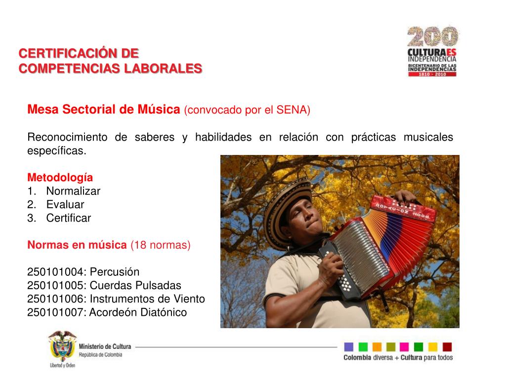 CERTIFICACIÓN DE COMPETENCIAS LABORALES Mesa Sectorial de Música (convocado por el SENA) Reconocimiento de saberes y habilidades en relación con prácticas musicales específicas. Metodología Normalizar Evaluar Certificar Normas en música (18 normas) 250101004: Percusión 250101005: Cuerdas Pulsadas 250101006: Instrumentos de Viento 250101007: Acordeón Diatónico