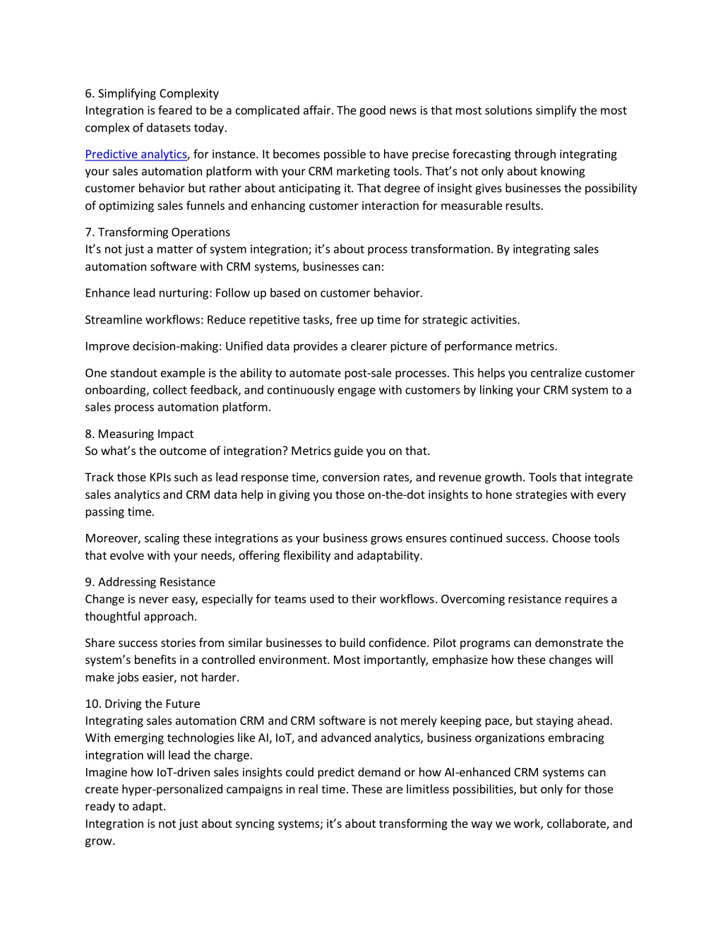 6. Simplifying Complexity Integration is feared to be a complicated affair. The good news is that most solutions simplify the most complex of datasets today. Predictive analytics, for instance. It becomes possible to have precise forecasting through integrating your sales automation platform with your CRM marketing tools. That’s not only about knowing customer behavior but rather about anticipating it. That degree of insight gives businesses the possibility of optimizing sales funnels and enhancing customer interaction for measurable results. 7. Transforming Operations It’s not just a matter of system integration; it’s about process transformation. By integrating sales automation software with CRM systems, businesses can: Enhance lead nurturing: Follow up based on customer behavior. Streamline workflows: Reduce repetitive tasks, free up time for strategic activities. Improve decision-making: Unified data provides a clearer picture of performance metrics. One standout example is the ability to automate post-sale processes. This helps you centralize customer onboarding, collect feedback, and continuously engage with customers by linking your CRM system to a sales process automation platform. 8. Measuring Impact So what’s the outcome of integration? Metrics guide you on that. Track those KPIs such as lead response time, conversion rates, and revenue growth. Tools that integrate sales analytics and CRM data help in giving you those on-the-dot insights to hone strategies with every passing time. Moreover, scaling these integrations as your business grows ensures continued success. Choose tools that evolve with your needs, offering flexibility and adaptability. 9. Addressing Resistance Change is never easy, especially for teams used to their workflows. Overcoming resistance requires a thoughtful approach. Share success stories from similar businesses to build confidence. Pilot programs can demonstrate the system’s benefits in a controlled environment. Most importantly, emphasize how these changes will make jobs easier, not harder. 10. Driving the Future Integrating sales automation CRM and CRM software is not merely keeping pace, but staying ahead. With emerging technologies like AI, IoT, and advanced analytics, business organizations embracing integration will lead the charge. Imagine how IoT-driven sales insights could predict demand or how AI-enhanced CRM systems can create hyper-personalized campaigns in real time. These are limitless possibilities, but only for those ready to adapt. Integration is not just about syncing systems; it’s about transforming the way we work, collaborate, and grow.
