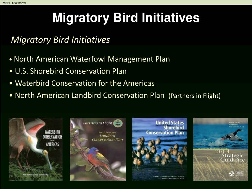 Migratory Bird Initiatives Migratory Bird Initiatives • North American Waterfowl Management Plan • U.S. Shorebird Conservation Plan • Waterbird Conservation for the Americas • North American Landbird Conservation Plan (Partners in Flight)