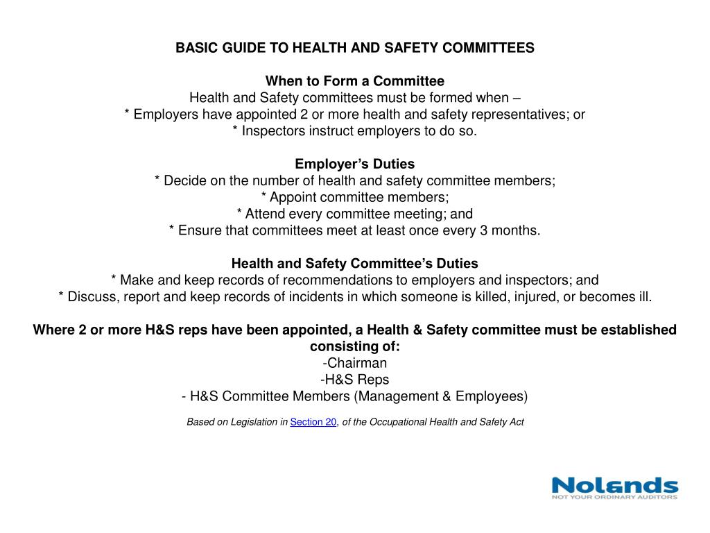 BASIC GUIDE TO HEALTH AND SAFETY COMMITTEESWhen to Form a CommitteeHealth and Safety committees must be formed when –* Employers have appointed 2 or more health and safety representatives; or* Inspectors instruct employers to do so.Employer’s Duties* Decide on the number of health and safety committee members;* Appoint committee members;* Attend every committee meeting; and* Ensure that committees meet at least once every 3 months.Health and Safety Committee’s Duties* Make and keep records of recommendations to employers and inspectors; and* Discuss, report and keep records of incidents in which someone is killed, injured, or becomes ill.Where 2 or more H&S reps have been appointed, a Health & Safety committee must be established consisting of:-Chairman-H&S Reps- H&S Committee Members (Management & Employees)Based on Legislation inSection 20, of the Occupational Health and Safety Act