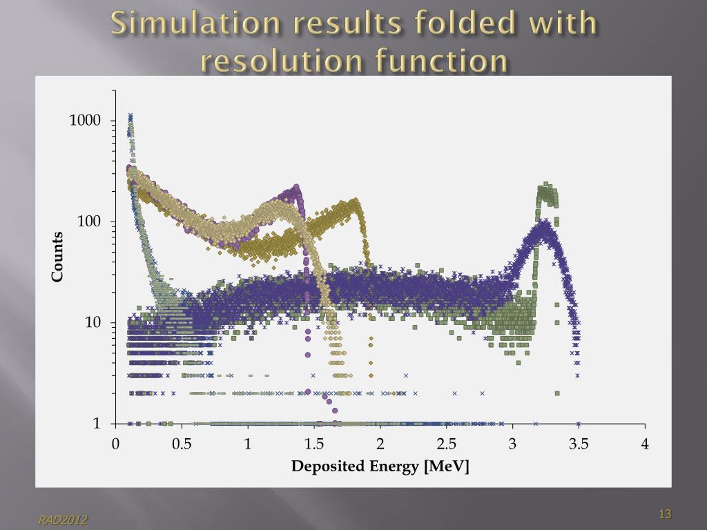 Thermal – epithermal peak (764 keV) He-3 counter spectra Fullenergy peak Recoil peak 3He(n,elastic) 0.75*En 3He(n,p)3H Q=764 keV 3He(n,d)2H Q=-3.3 MeV RAD2012