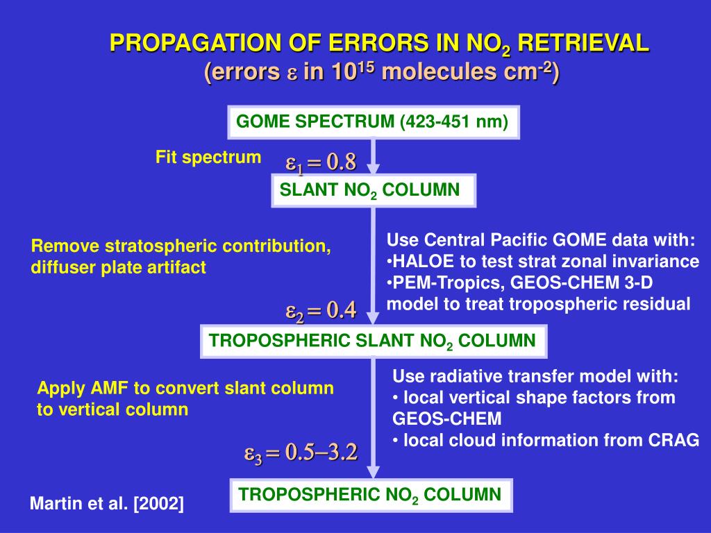 GOME SPECTRUM (423-451 nm) SLANT NO2 COLUMN TROPOSPHERIC SLANT NO2 COLUMN TROPOSPHERIC NO2 COLUMN PROPAGATION OF ERRORS IN NO2 RETRIEVAL(errors e in 1015 molecules cm-2) Fit spectrum e1 = 0.8 • Use Central Pacific GOME data with: • HALOE to test strat zonal invariance • PEM-Tropics, GEOS-CHEM 3-D model to treat tropospheric residual Remove stratospheric contribution, diffuser plate artifact e2 = 0.4 • Use radiative transfer model with: • local vertical shape factors from GEOS-CHEM • local cloud information from CRAG Apply AMF to convert slant column to vertical column e3 = 0.5-3.2 Martin et al. [2002]