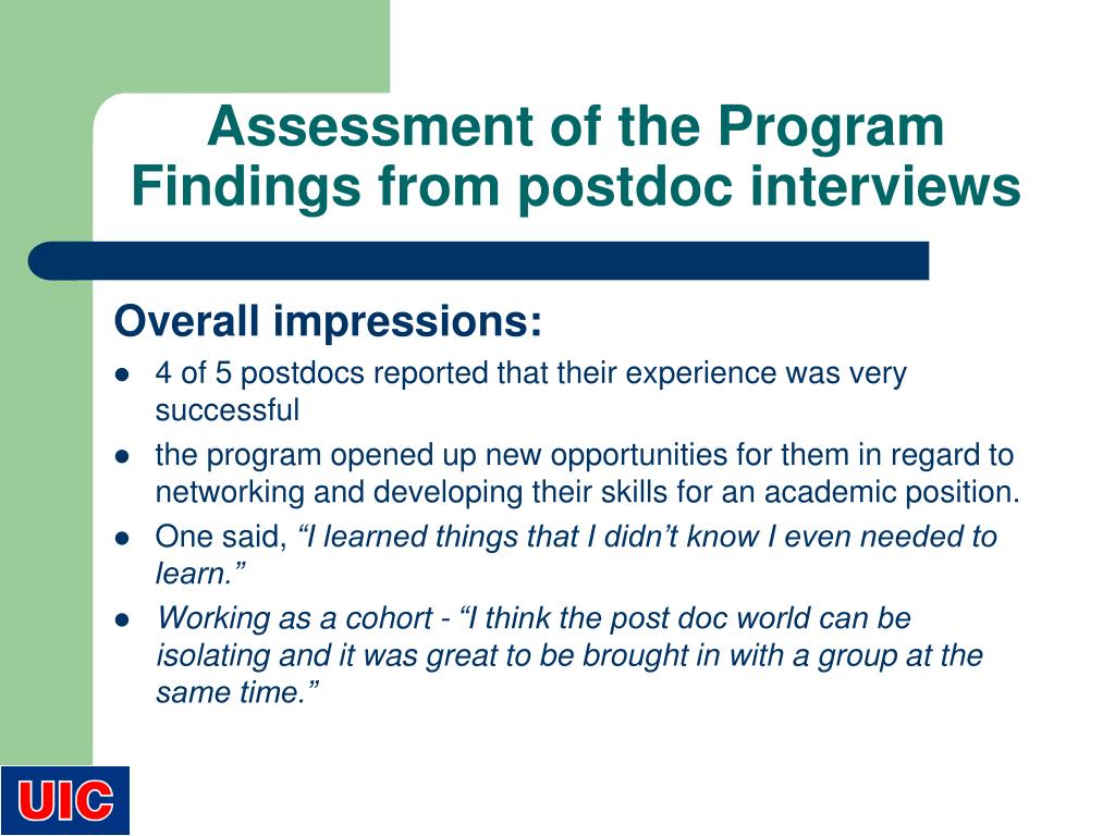 Assessment of the ProgramFindings from postdoc interviews Experience with the program Both before and after the 2 year program the words the postdocs used to describe the program were: wholistic, constructive, supportive, informative, and educational.