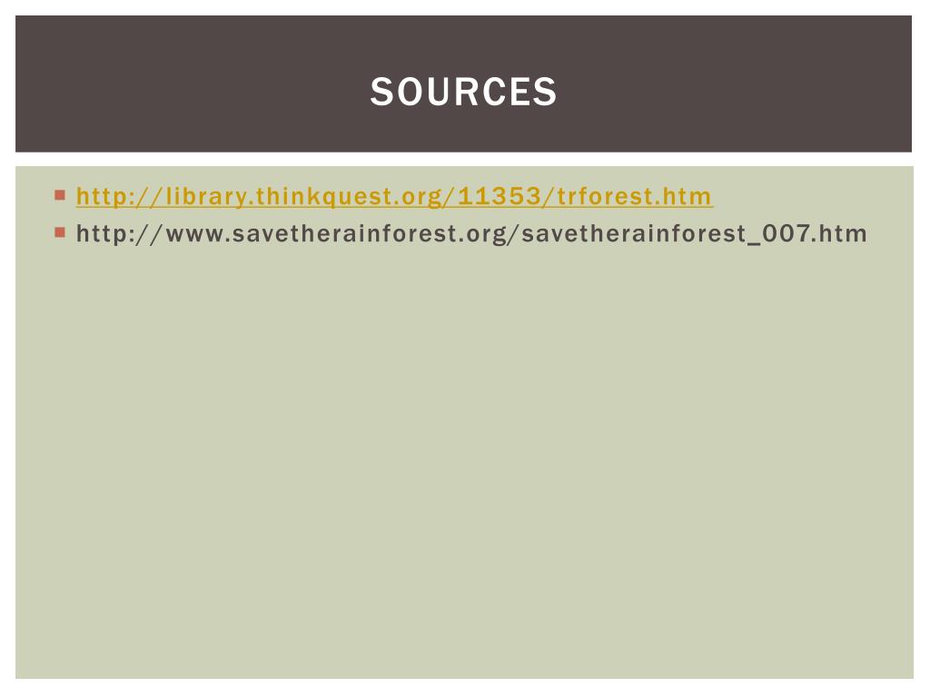 Sources • http://library.thinkquest.org/11353/trforest.htm • http://www.savetherainforest.org/savetherainforest_007.htm