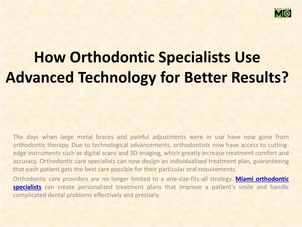 How Orthodontic Specialists Use Advanced Technology for Better Results? The days when large metal braces and painful adjustments were in use have now gone from orthodontic therapy. Due to technological advancements, orthodontists now have access to cutting-edge instruments such as digital scans and 3D imaging, which greatly increase treatment comfort and accuracy. Orthodontic care specialists can now design an individualized treatment plan, guaranteeing that each patient gets the best care possible for their particular oral requirements. Orthodontic care providers are no longer limited to a one-size-fits-all strategy. Miami orthodontic specialistscan create personalized treatment plans that improve a patient's smile and handle complicated dental problems effectively and precisely.