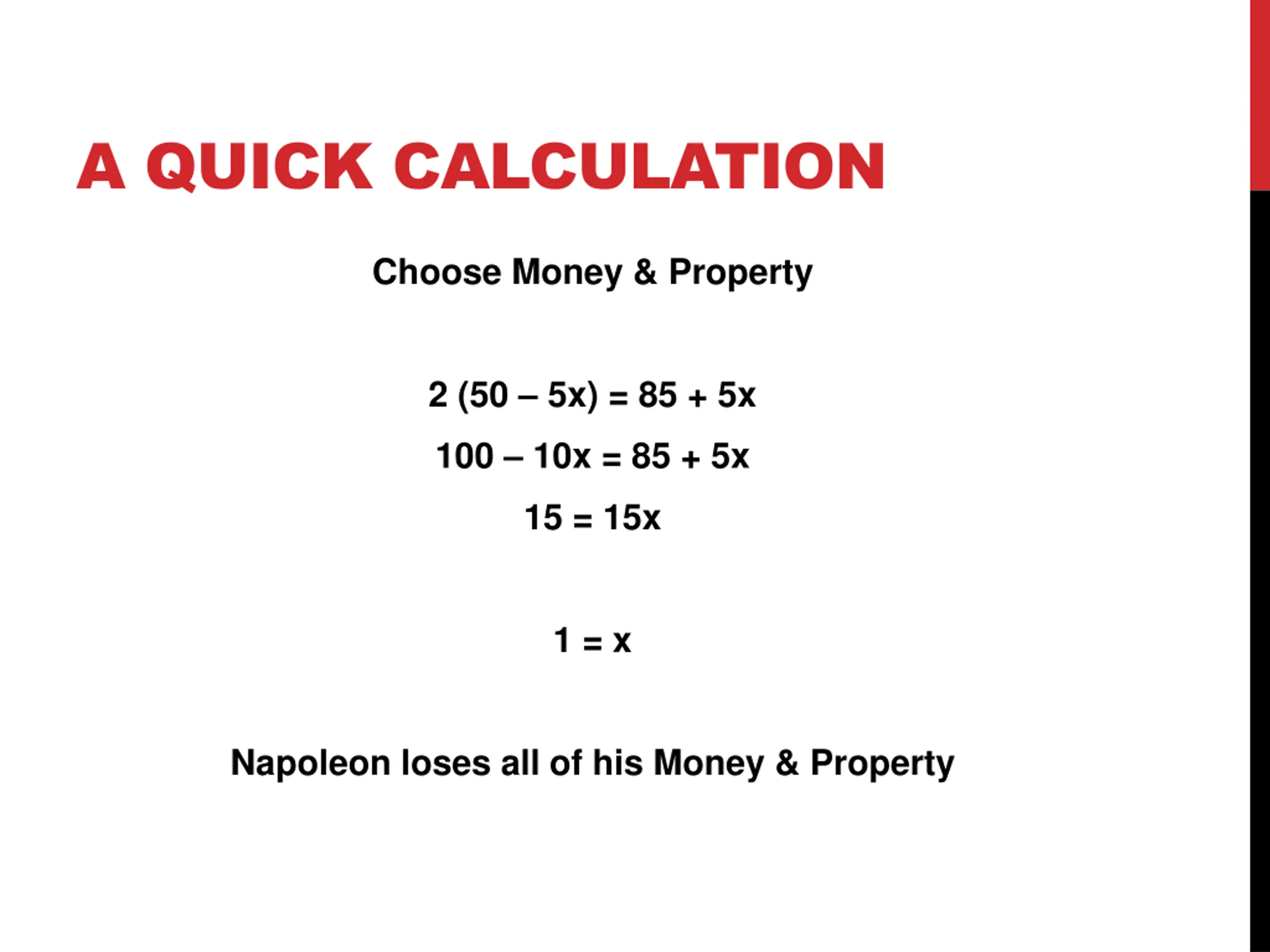 A QUICK CALCULATION Choose Money & Property 2 (50 – 5x) = 85 + 5x 100 – 10x = 85 + 5x 15 = 15x 1 = x Napoleon loses all of his Money & Property