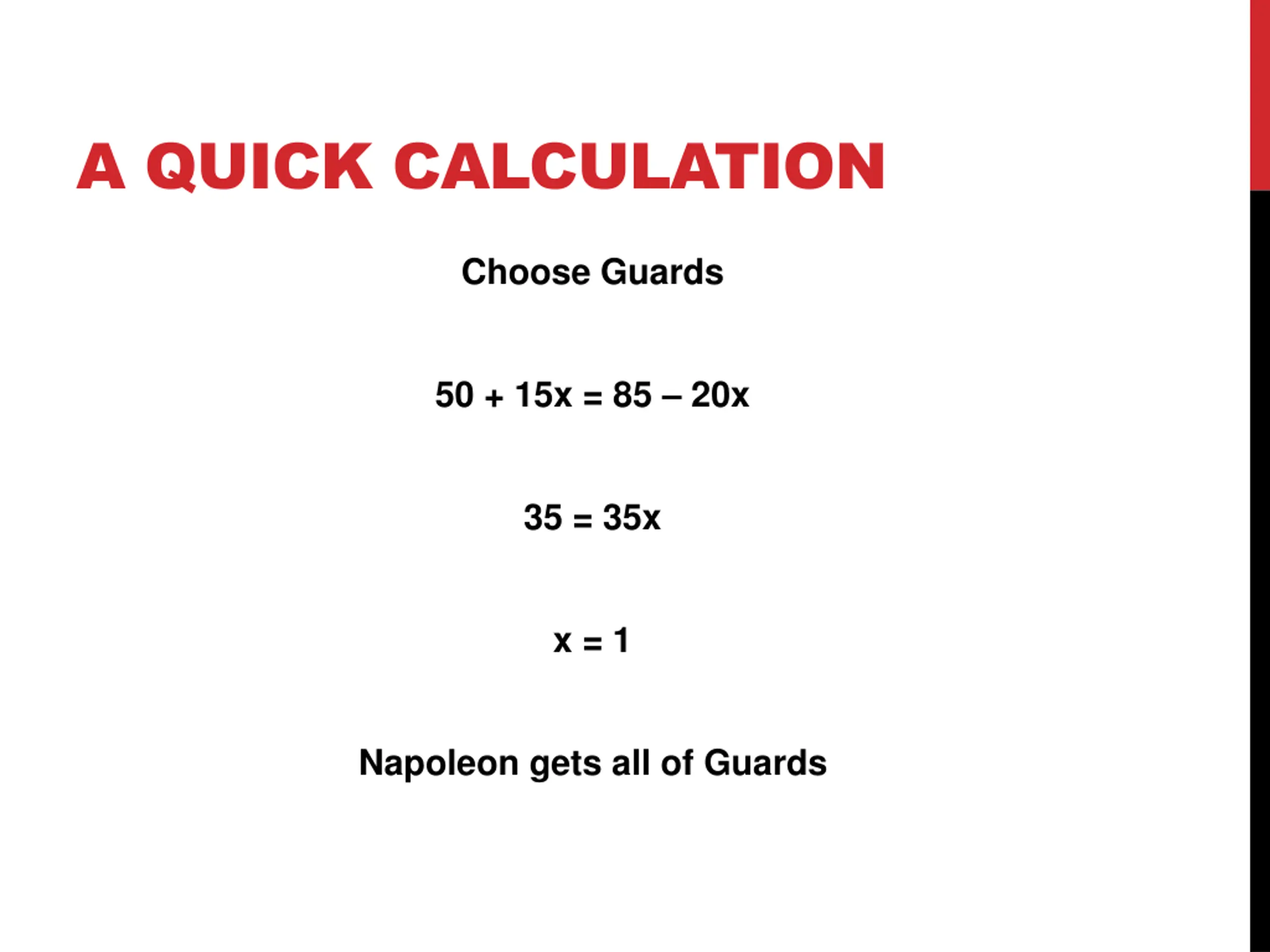 A QUICK CALCULATION Choose Guards 50 + 15x = 85 – 20x 35 = 35x x = 1 Napoleon gets all of Guards