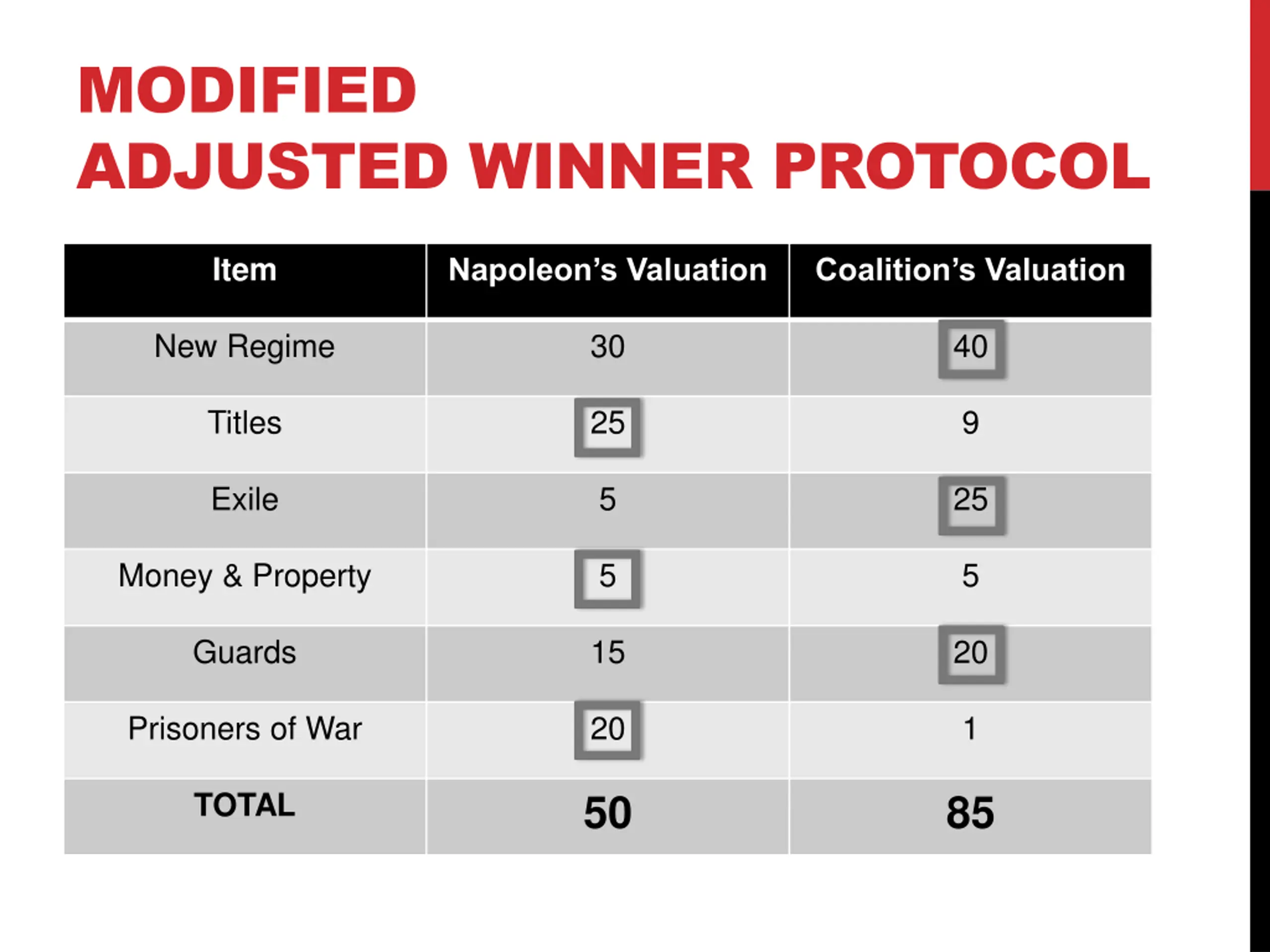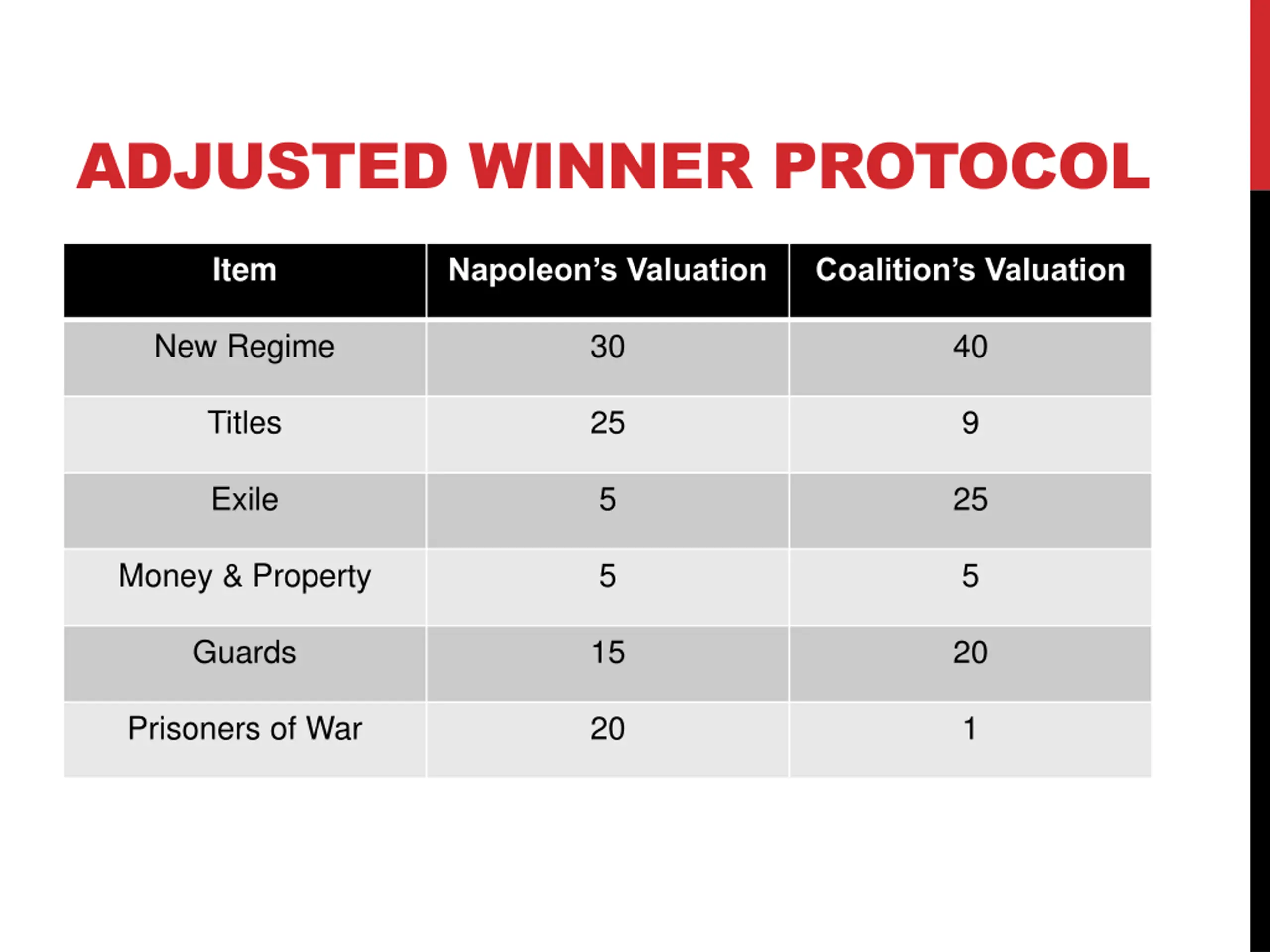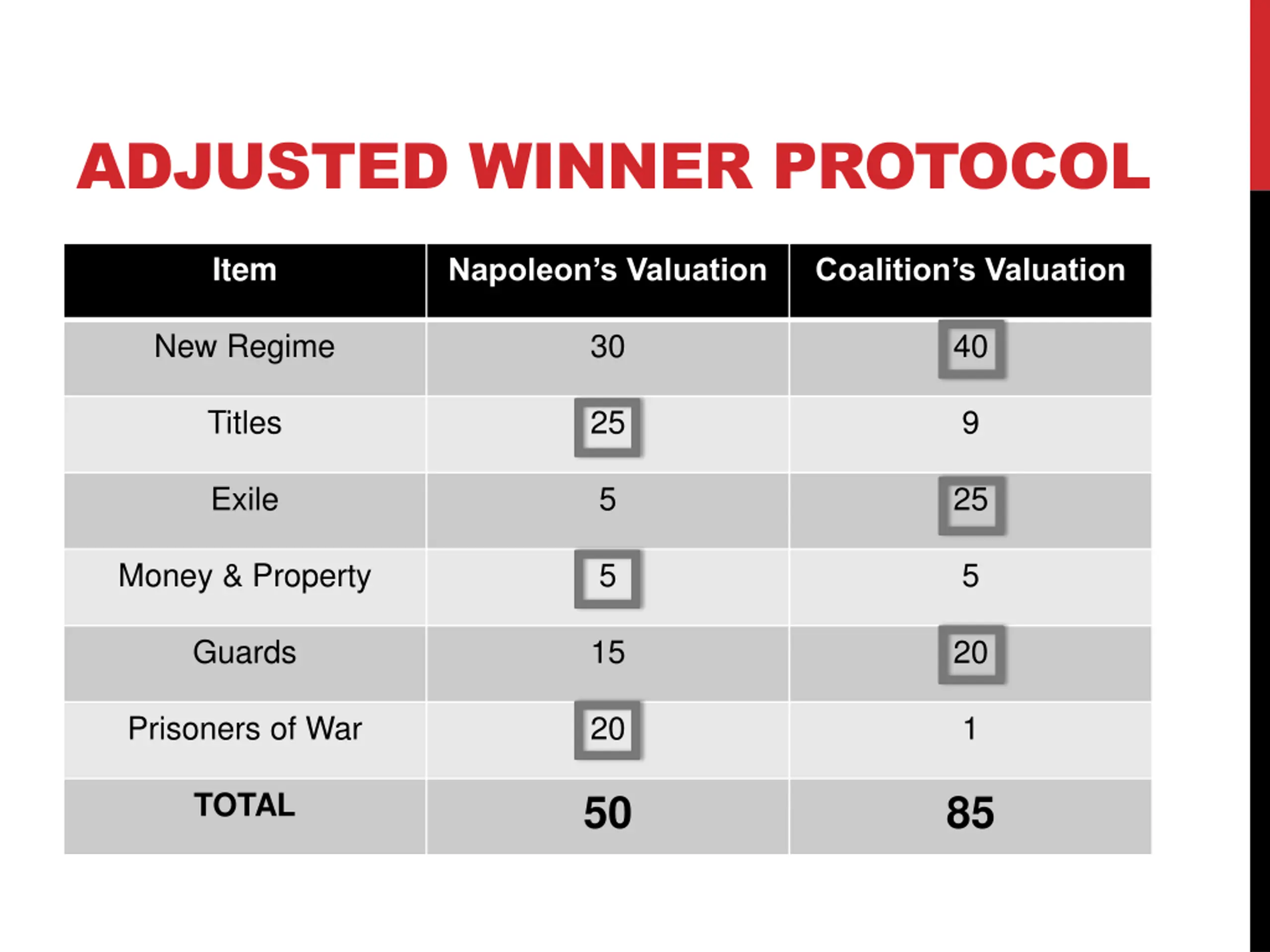 ADJUSTED WINNER PROTOCOL Item Napoleon’s Valuation Coalition’s Valuation New Regime 30 40 Titles 25 9 Exile 5 25 Money & Property 5 5 Guards 15 20 Prisoners of War 20 1 TOTAL 50 85