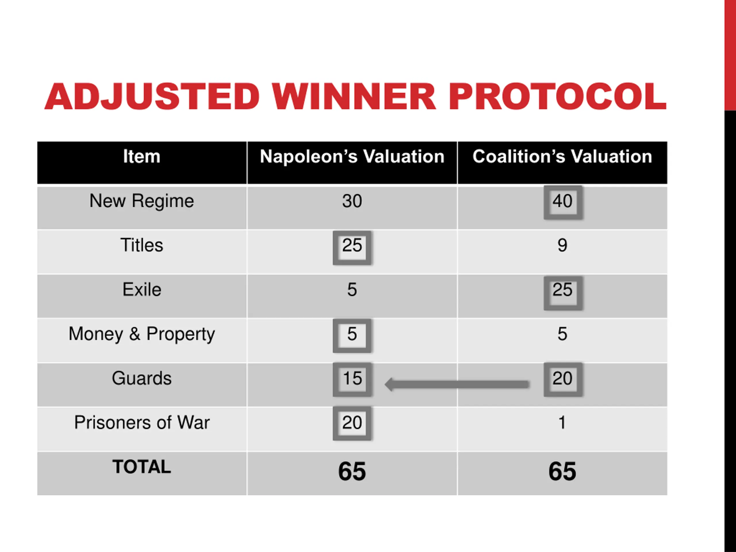 ADJUSTED WINNER PROTOCOL Item Napoleon’s Valuation Coalition’s Valuation New Regime 30 40 Titles 25 9 Exile 5 25 Money & Property 5 5 Guards 15 20 Prisoners of War 20 1 TOTAL 65 65