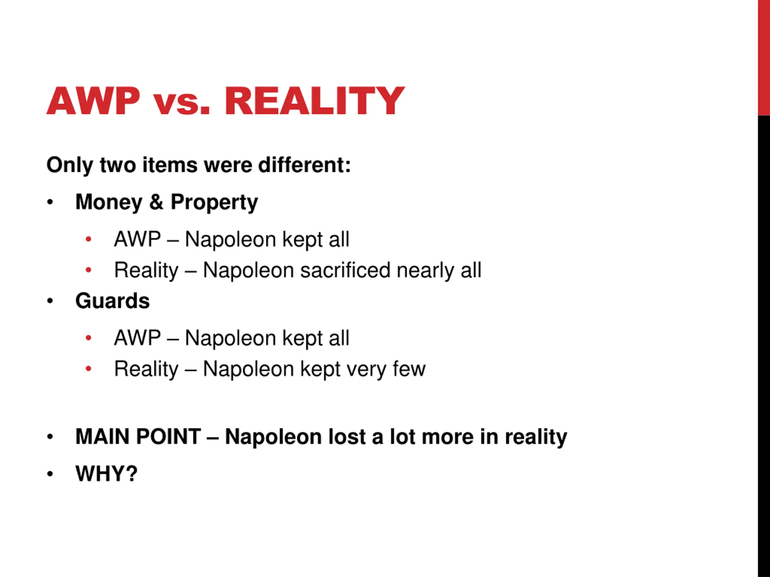 AWP vs. REALITY Only two items were different: Money & Property • AWP – Napoleon kept all Reality – Napoleon sacrificed nearly all Guards • • • AWP – Napoleon kept all Reality – Napoleon kept very few • • MAIN POINT – Napoleon lost a lot more in reality • WHY? •