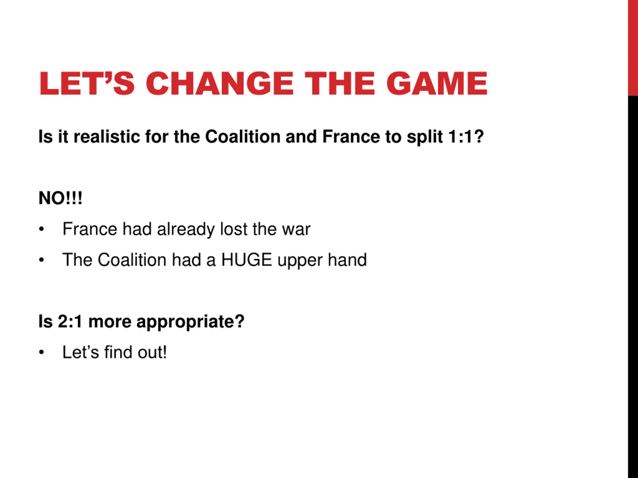 LET’S CHANGE THE GAME Is it realistic for the Coalition and France to split 1:1? NO!!! France had already lost the war • The Coalition had a HUGE upper hand • Is 2:1 more appropriate? • Let’s find out!
