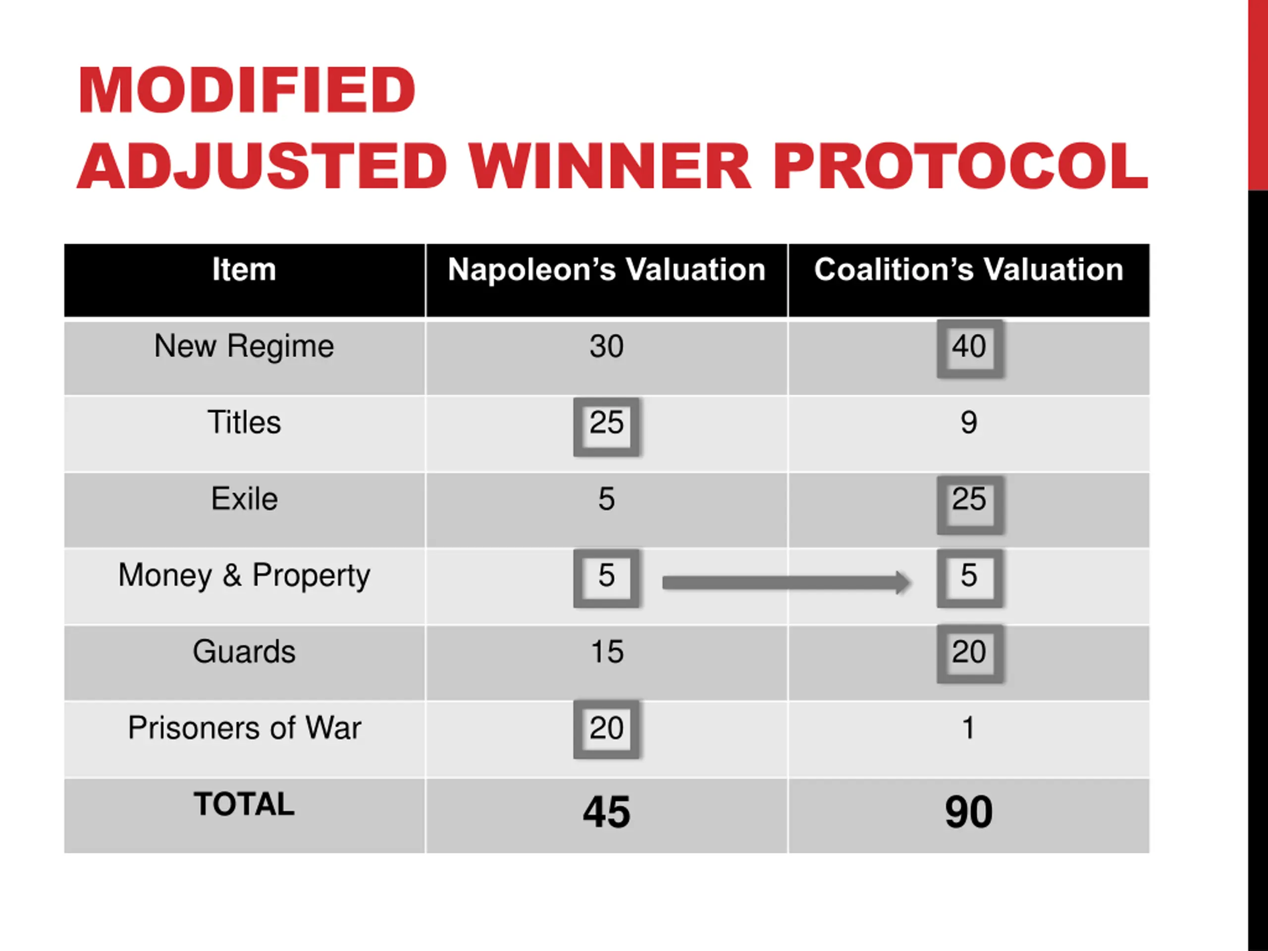 MODIFIED ADJUSTED WINNER PROTOCOL Item Napoleon’s Valuation Coalition’s Valuation New Regime 30 40 Titles 25 9 Exile 5 25 Money & Property 5 5 Guards 15 20 Prisoners of War 20 1 TOTAL 45 90