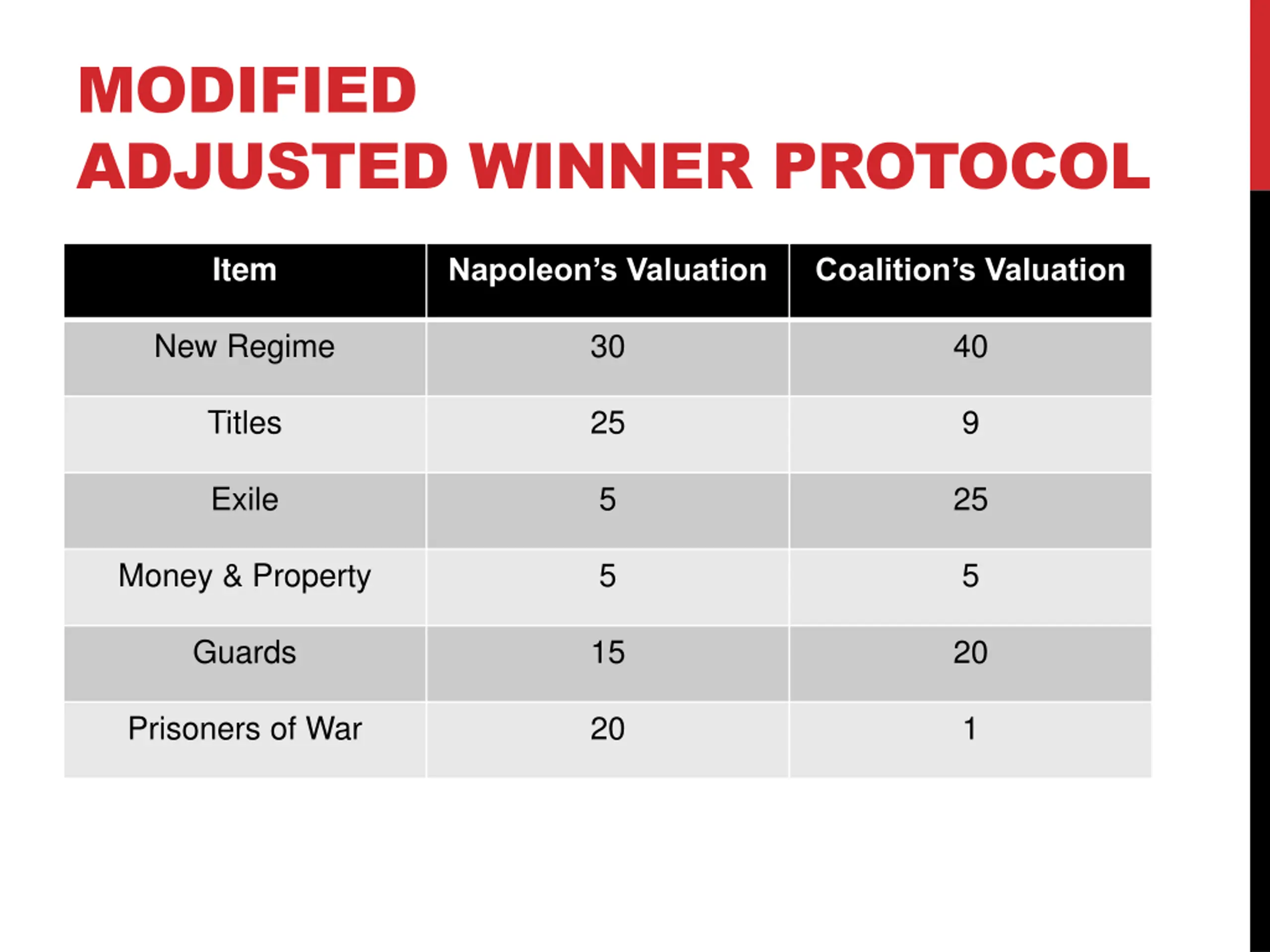 MODIFIED ADJUSTED WINNER PROTOCOL Item Napoleon’s Valuation Coalition’s Valuation New Regime 30 40 Titles 25 9 Exile 5 25 Money & Property 5 5 Guards 15 20 Prisoners of War 20 1